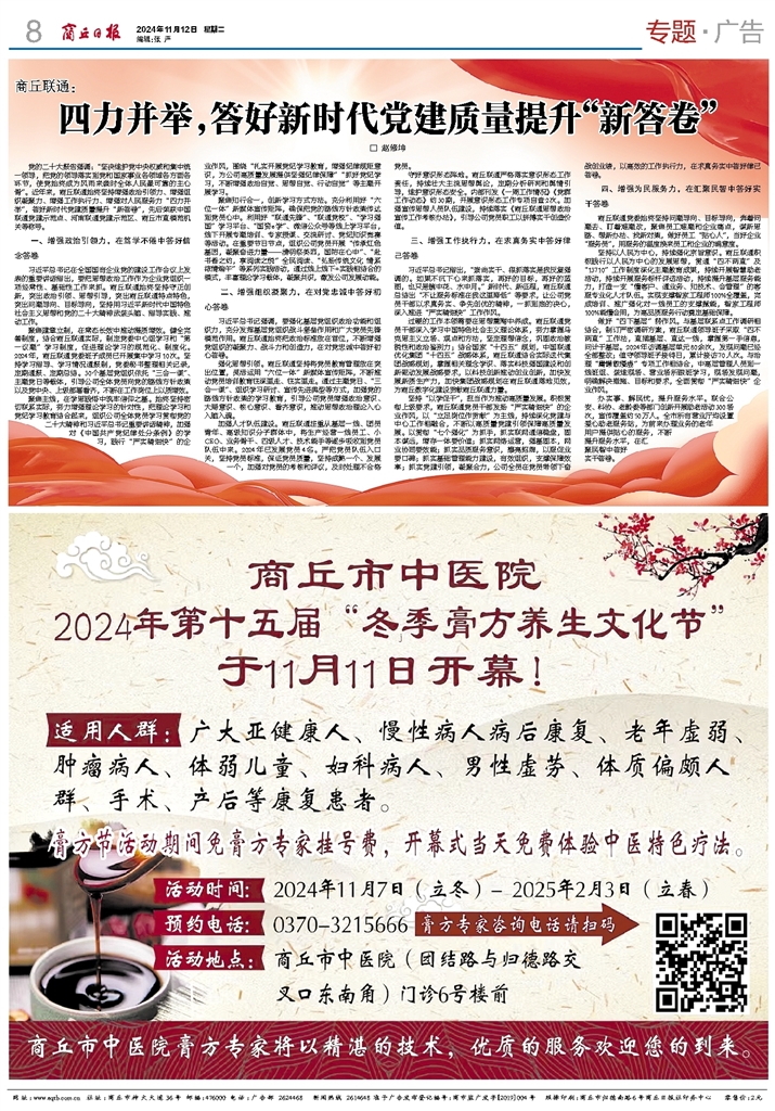 <div style='font-size: 22px!important;line-height: 34px!important;text-align: justify!important;color: #000!important'>商丘联通:四力并举,答好新时代党建质量提升“新答卷”</div><div style='font-size: 14px!important;line-height: 22px!important;text-align: left!important;color: #777!important;margin-top: 20px;'>商丘日报云阅读  赵修坤  2024-11-12</div><div><img id='paperImg' style='max-width: 100%;height: auto' src='//img.founderfx.cn/epaper/202411/12/82582eaa43e540a78ed3a9b336866f3e/8.jpg' alt='' class='page-img'/></div><p> 党的二十大报告强调:“坚决维护党中央权威和集中统一领导,把党的领导落实到党和国家事业各领域各方面各环节,使党始终成为风雨来袭时全体人民最可靠的主心骨”。近年来,商丘联通始终坚持增强政治引领力、增强组织凝聚力、增强工作执行力、增强对人民服务力“四力并举”,答好新时代党建质量提升“新答卷”,先后荣获中国联通党建示范点、河南联通党建示范区、商丘市直模范机关等称号。</p><p> 一、增强政治引领力,在笃学不倦中答好信念答卷</p><p> 习近平总书记在全国国有企业党的建设工作会议上发表的重要讲话指出,要把思想政治工作作为企业党组织一项经常性、基础性工作来抓。商丘联通始终坚持守正创新,突出政治引领、思想引导,突出商丘联通特点特色,突出问题导向、目标导向,坚持用习近平新时代中国特色社会主义思想和党的二十大精神武装头脑、指导实践、推动工作。</p><p> 聚焦建章立制,在常态长效中推动提质增效。健全完善制度,结合商丘联通实际,制定党委中心组学习和“第一议题”学习制度,促进理论学习的规范化、制度化。2024年,商丘联通党委班子成员已开展集中学习10次。坚持学习指导、学习情况通报制,党委秘书整理相关记录,定期通报、定期总结。30个基层党组织依托“三会一课”、主题党日等载体,引导公司全体党员向党的路线方针政策以及党中央、上级部署看齐,不断在工作岗位上以质增效。</p><p> 聚焦主线,在学思践悟中筑牢信仰之基。始终坚持密切联系实际,努力增强理论学习的针对性,把理论学习和党纪学习教育结合起来,组织公司全体党员学习贯彻党的二十大精神和习近平总书记重要讲话精神,加强对《中国共产党纪律处分条例》的学习,践行“严实精细快”的企业作风,围绕“扎实开展党纪学习教育,增强纪律规矩意识,为公司高质量发展提供坚强纪律保障”“抓好党纪学习,不断增强政治自觉、思想自觉、行动自觉”等主题开展学习。</p><p> 聚焦知行合一,创新学习方式方法。充分利用好“六位一体”新媒体宣传矩阵,确保把党的路线方针政策传达到党员心中。利用好“联通先锋”、“联通党校”、“学习强国”学习平台、“国资e学”、微信公众号等线上学习平台,线下开展专题培训、专家授课、交流研讨、党纪知识竞赛等活动。在重要节日节点,组织公司党员开展“传承红色基因,凝聚奋进力量——清明祭英烈,国防在心中”、“赴书香之约,享阅读之悦”全民阅读、“弘扬传统文化 情系浓情端午”等系列实践活动,通过线上线下+实践相结合的模式,丰富理论学习载体,凝聚共识,激发公司发展动能。</p><p> 二、增强组织凝聚力,在对党忠诚中答好初心答卷</p><p> 习近平总书记强调,要强化基层党组织政治功能和组织力,充分发挥基层党组织战斗堡垒作用和广大党员先锋模范作用。商丘联通始终把政治标准放在首位,不断增强党组织的凝聚力、战斗力和创造力,在对党忠诚中答好初心答卷。</p><p> 强化思想引领。商丘联通坚持将党员教育管理放在突出位置,灵活运用“六位一体”新媒体宣传矩阵,不断推动党员培训教育往深里走、往实里走。通过主题党日、“三会一课”、组织学习研讨、宣传先进典型等方式,加强党的路线方针政策的学习教育,引导公司党员增强政治意识、大局意识、核心意识、看齐意识,推动思想政治理论入心入脑入魂。</p><p> 加强人才队伍建设。商丘联通注重从基层一线、团员青年、高级知识分子群体中,将生产经营一线员工、小CEO、业务骨干、四级人才、技术能手等逐步吸收到党员队伍中来。2024年已发展党员4名。严把党员队伍入口关,坚持党员标准,保证党员质量,坚持成熟一个、发展一个,加强对党员的考核和评议,及时处理不合格党员。</p><p> 守好意识形态阵地。商丘联通严格落实意识形态工作责任,持续壮大主流思想舆论,定期分析研判和舆情引导,维护意识形态安全。内部刊发《一周工作情况》《党群工作动态》约30期,开展意识形态工作专项自查2次。加强宣传思想人员队伍建设,持续落实《商丘联通思想政治宣传工作考核办法》,引导公司党员职工以拼搏实干创造价值。</p><p> 三、增强工作执行力,在求真务实中答好律己答卷</p><p> 习近平总书记指出,“崇尚实干、狠抓落实是我反复强调的。如果不沉下心来抓落实,再好的目标,再好的蓝图,也只是镜中花、水中月。”新时代、新征程,商丘联通总结出“不让服务标准在我这里降低”等要求,让公司党员干部以求真务实、争先创优的精神,一抓到底的决心,深入推进“严实精细快”工作作风。</p><p> 过硬的工作本领需要在思想熏陶中养成。商丘联通党员干部深入学习中国特色社会主义理论体系,努力掌握马克思主义立场、观点和方法,坚定理想信念,巩固政治敏锐性和政治鉴别力;结合国家“