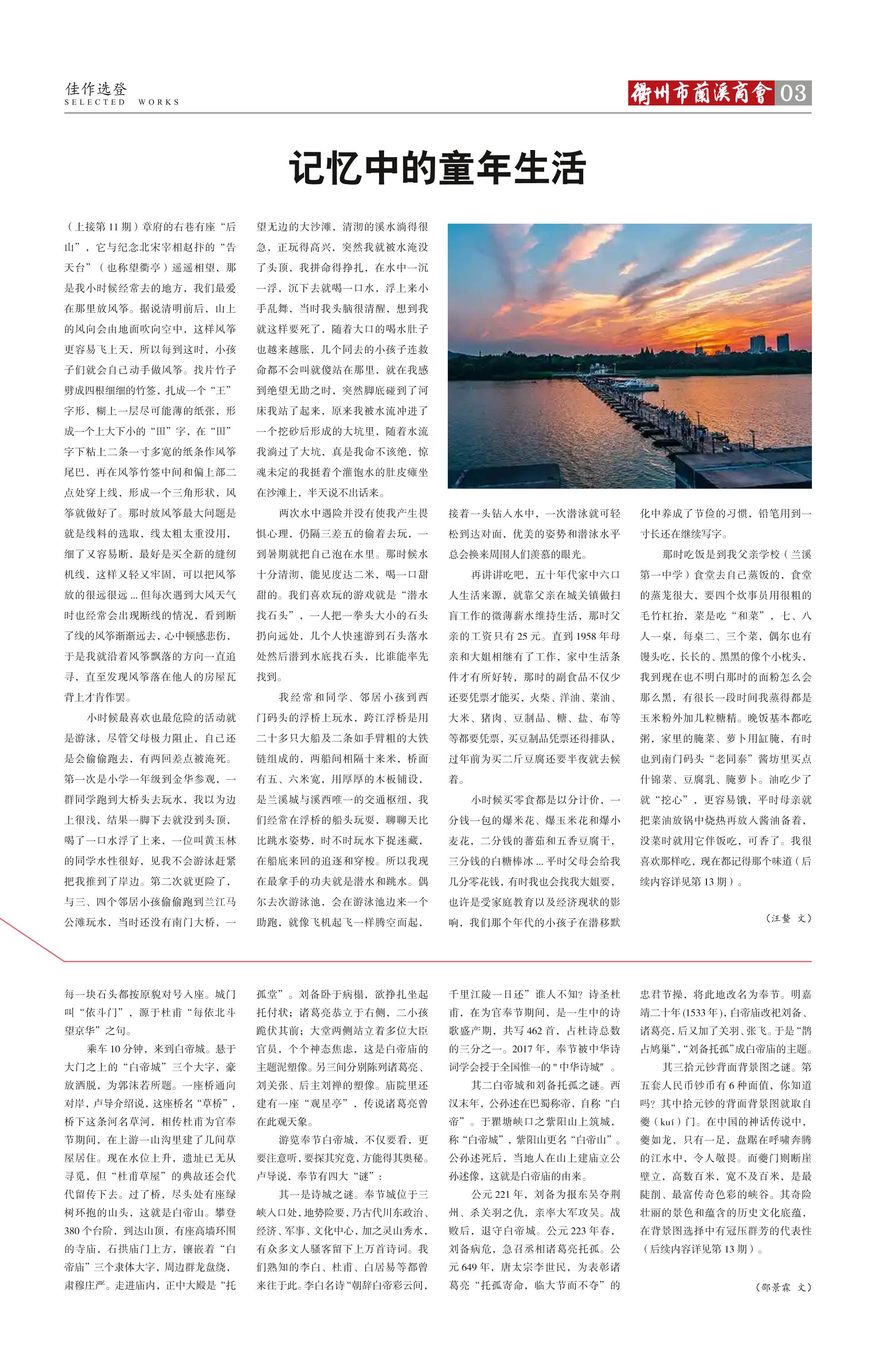 <span style="font-family: 宋体;">那时吃饭是到我父亲学校(兰溪第一中学)食堂去自己蒸饭的,食堂的蒸茏很大,要四个炊事员用很粗的毛竹杠抬,菜是吃“和菜”,七、八人一桌,每桌二、三个菜,偶尔也有馒头吃,长长的、黑黑的像个小枕头,我到现在也不明白那时的面粉怎么会那么黑,有很长一段时间我蒸得都是玉米粉外加几粒糖精。晚饭基本都吃粥,家里的腌菜、萝卜用缸腌,有时也到南门码头“老同泰”酱坊里买点什锦菜、豆腐乳、腌萝卜。油吃少了就“挖心”,更容易饿,平时母亲就把菜油放锅中烧热再放入酱油备着,没菜时就用它伴饭吃,可香了。我很喜欢那样吃,现在都记得那个味道(后续内容详见第13期)。</span>
