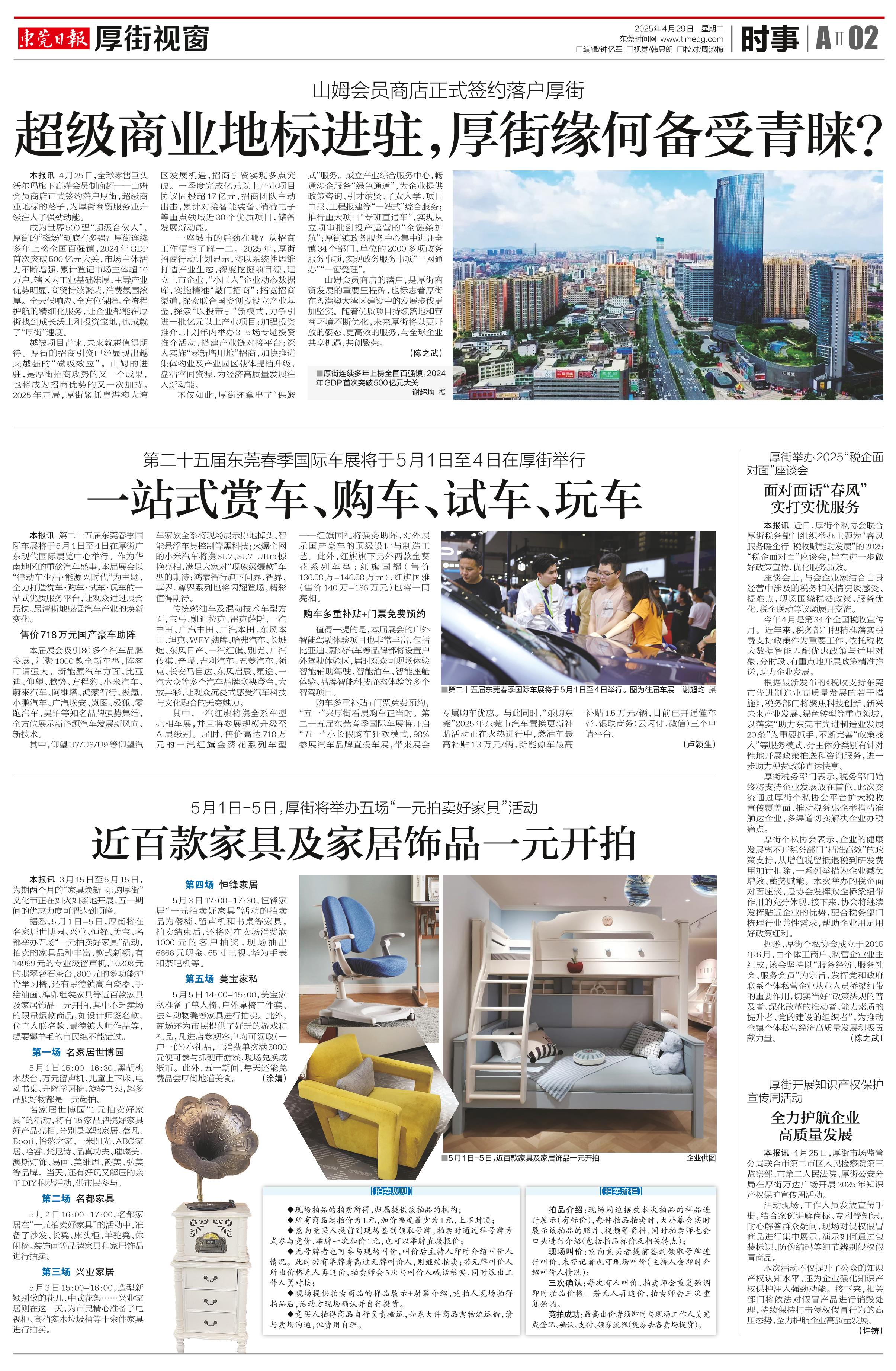 <div style='font-size: 16px!important;line-height: 28px!important;text-align: justify;color: #777!important;'>第二十五届东莞春季国际车展将于5月1日至4日在厚街举行</div><div style='font-size: 22px!important;line-height: 34px!important;text-align: justify!important;color: #000!important'>一站式赏车、购车、试车、玩车</div><div style='font-size: 14px!important;line-height: 22px!important;text-align: left!important;color: #777!important;margin-top: 20px;'>厚街视窗  (卢颖生)  2025-04-29</div><div><img id='paperImg' style='max-width: 100%;height: auto' src='//img.founderfx.cn/epaper/202504/30/32917a8c601b4f80b49fe7b1313d0b30/2.jpg' alt='' class='page-img'/></div><div style='font-size: 14px!important;line-height: 22px!important;text-align: center!important;color: #777!important;'><img src='//img.founderfx.cn/epaper/202504/30/32917a8c601b4f80b49fe7b1313d0b30/B02/18453784_sm1_1745755858833_s.jpg'style='display: block!important;margin: auto!important;max-width: 100%!important;'/> ■第二十五届东莞春季国际车展将于5月1日至4日举行。图为往届车展 谢超均 摄</div><p> 本报讯 第二十五届东莞春季国际车展将于5月1日至4日在厚街广东现代国际展览中心举行。作为华南地区的重磅汽车盛事,本届展会以“律动车生活·能源兴时代”为主题,全力打造赏车·购车·试车·玩车的一站式优质服务平台,让观众通过展会最快、最清晰地感受汽车产业的焕新变化。</p><p> 售价718万元国产豪车助阵</p><p> 本届展会吸引80多个汽车品牌参展,汇聚1000款全新车型,阵容可谓强大。新能源汽车方面,比亚迪、仰望、腾势、方程豹、小米汽车、蔚来汽车、阿维塔、鸿蒙智行、极氪、小鹏汽车、广汽埃安、岚图、极狐、零跑汽车、昊铂等知名品牌强势集结,全方位展示新能源汽车发展新风向、新技术。</p><p> 其中,仰望U7/U8/U9等仰望汽车家族全系将现场展示原地掉头、智能悬浮车身控制等黑科技;火爆全网的小米汽车将携SU7、SU7 Ultra惊艳亮相,满足大家对“现象级爆款”车型的期待;鸿蒙智行旗下问界、智界、享界、尊界系列也将闪耀登场,精彩值得期待。</p><p> 传统燃油车及混动技术车型方面,宝马、凯迪拉克、雷克萨斯、一汽丰田、广汽丰田、广汽本田、东风本田、坦克、WEY魏牌、哈弗汽车、长城炮、东风日产、一汽红旗、别克、广汽传祺、奇瑞、吉利汽车、五菱汽车、领克、长安马自达、东风启辰、星途、一汽大众等多个汽车品牌联袂登台,大放异彩,让观众沉浸式感受汽车科技与文化融合的无穷魅力。</p><p> 其中,一汽红旗将携全系车型亮相车展,并且将参展规模升级至A展级别。届时,售价高达718万元的一汽红旗金葵花系列车型——红旗国礼将强势助阵,对外展示国产豪车的顶级设计与制造工艺。此外,红旗旗下另外两款金葵花系列车型:红旗国耀(售价136.58万-146.58万元)、红旗国雅(售价140万-186万元)也将一同亮相。</p><p> 购车多重补贴+门票免费预约</p><p> 值得一提的是,本届展会的户外智能驾驶体验项目也非常丰富,包括比亚迪、蔚来汽车等品牌都将设置户外驾驶体验区,届时观众可现场体验智能辅助驾驶、智能泊车、智能座舱体验、品牌智能科技静态体验等多个智驾项目。</p><p> 购车多重补贴+门票免费预约,“五一”来厚街看展购车正当时。第二十五届东莞春季国际车展将开启“五一”小长假购车狂欢模式,98%参展汽车品牌直投车展,带来展会专属购车优惠。与此同时,“乐购东莞”2025年东莞市汽车置换更新补贴活动正在火热进行中,燃油车最高补贴1.3万元/辆,新能源车最高补贴1.5万元/辆,目前已开通懂车帝、银联商务(云闪付、微信)三个申请平台。</p>