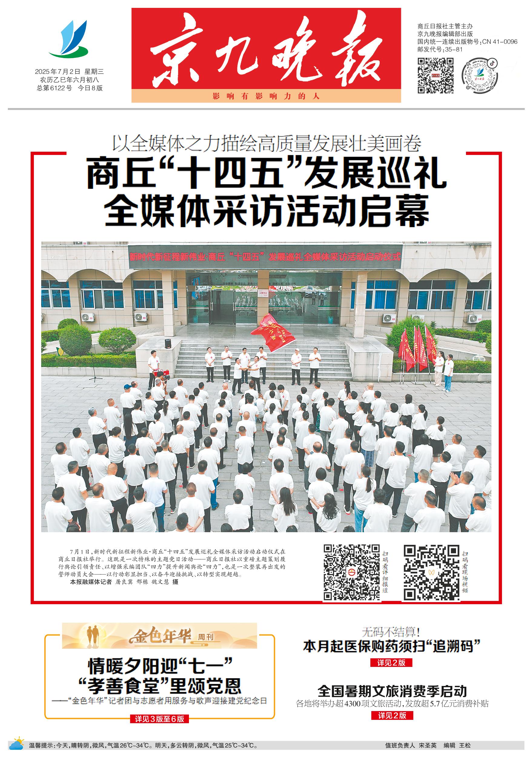 <div style='font-size: 16px!important;line-height: 28px!important;text-align: justify;color: #777!important;'>以全媒体之力描绘高质量发展壮美画卷</div><div style='font-size: 22px!important;line-height: 34px!important;text-align: justify!important;color: #000!important'>商丘“十四五”发展巡礼全媒体采访活动启幕</div><div style='font-size: 14px!important;line-height: 22px!important;text-align: left!important;color: #777!important;margin-top: 20px;'>京九晚报云阅读  本报融媒体记者 屠良冀 邢栋 魏文慧 摄  2025-07-02</div><div><img id='paperImg' style='max-width: 100%;height: auto' src='//img.founderfx.cn/epaper/202507/02/dc142b96ad9f417d9d98081171cea35f/1.jpg' alt='' class='page-img'/></div><div style='font-size: 14px!important;line-height: 22px!important;text-align: center!important;color: #777!important;'><img src='//img.founderfx.cn/epaper/202507/02/dc142b96ad9f417d9d98081171cea35f/01/j0702_aa_s.jpg'style='display: block!important;margin: auto!important;max-width: 100%!important;'/><img src='//img.founderfx.cn/epaper/202507/02/dc142b96ad9f417d9d98081171cea35f/01/j0702_ab_s.jpg'style='display: block!important;margin: auto!important;max-width: 100%!important;'/> 扫码看详细报道<img src='//img.founderfx.cn/epaper/202507/02/dc142b96ad9f417d9d98081171cea35f/01/j0702_ac_s.jpg'style='display: block!important;margin: auto!important;max-width: 100%!important;'/> 扫码看现场视频</div><p> 7月1日,新时代新征程新伟业·商丘“十四五”发展巡礼全媒体采访活动启动仪式在商丘日报社举行。这既是一次特殊的主题党日活动——商丘日报社以重磅主题策划履行舆论引领责任、以增强采编团队“四力”提升新闻舆论“四力”,也是一次整装再出发的誓师动员大会——以行动彰显担当、以奋斗迎接挑战、以转型实现超越。</p>
