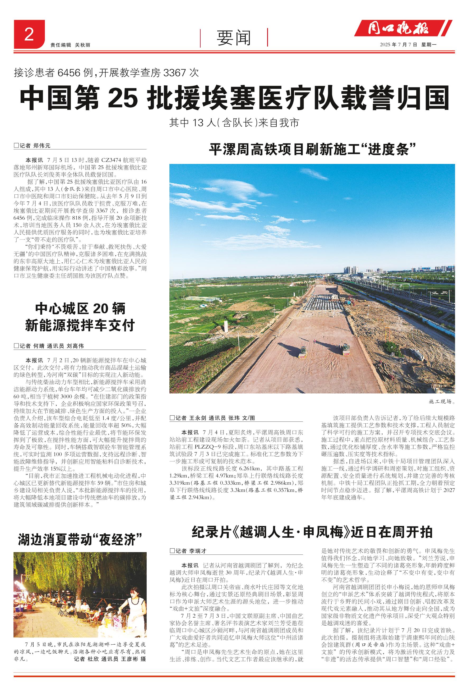 <div style='font-size: 22px!important;line-height: 34px!important;text-align: justify!important;color: #000!important'>平漯周高铁项目刷新施工“进度条”</div><div style='font-size: 14px!important;line-height: 22px!important;text-align: left!important;color: #777!important;margin-top: 20px;'>周口晚报  2025-07-07</div><div><img id='paperImg' style='max-width: 100%;height: auto' src='//img.founderfx.cn/epaper/202507/06/9984452dc9504cb083ae91b377bc1d7f/2.jpg' alt='' class='page-img'/></div><div style='font-size: 14px!important;line-height: 22px!important;text-align: center!important;color: #777!important;'><img src='//img.founderfx.cn/epaper/202507/06/9984452dc9504cb083ae91b377bc1d7f/02/f2c00622d7f74cbf372e72e7f7829b55_3_s.jpg'style='display: block!important;margin: auto!important;max-width: 100%!important;'/> 施工现场。</div><p> □记者 王永剑 通讯员 张玮 文/图</p><p> 本报讯 7月4日,夏阳炙烤,平漯周高铁周口东站站前工程建设现场如火如荼。记者从项目部获悉,站前工程PLZZQ-9标段,周口东站基床以下路基填筑试验段7月3日已完成施工。标准化工艺参数为下一步施工形成可复制的技术范本。</p><p> 该标段正线线路长度6.261km,其中路基工程1.29km,桥梁工程4.97km;郑阜上行联络线线路长度3.319km(路基工程0.333km,桥梁工程2.986km),郑阜下行联络线线路长度3.3km(路基工程0.357km,桥梁工程2.943km)。</p><p> 该项目部负责人告诉记者,为了给后续大规模路基填筑施工提供工艺参数和技术支撑,工程人员制定了科学可行的施工方案,并召开专项技术交底会议。施工过程中,重点把控原材料质量、机械组合、工艺参数,通过优化松铺厚度、含水率等施工参数,严格监控碾压遍数、压实度等技术指标。</p><p> 据悉,自进场以来,中铁十局项目管理团队深入施工一线,通过科学调研和周密策划,对施工组织、资源配置、安全质量进行系统规划,并建立完善的考核机制。中铁十局工程团队正抢抓工期,全力朝着预定时间节点稳步迈进。据了解,平漯周高铁计划于2027年年底建成通车。</p>
