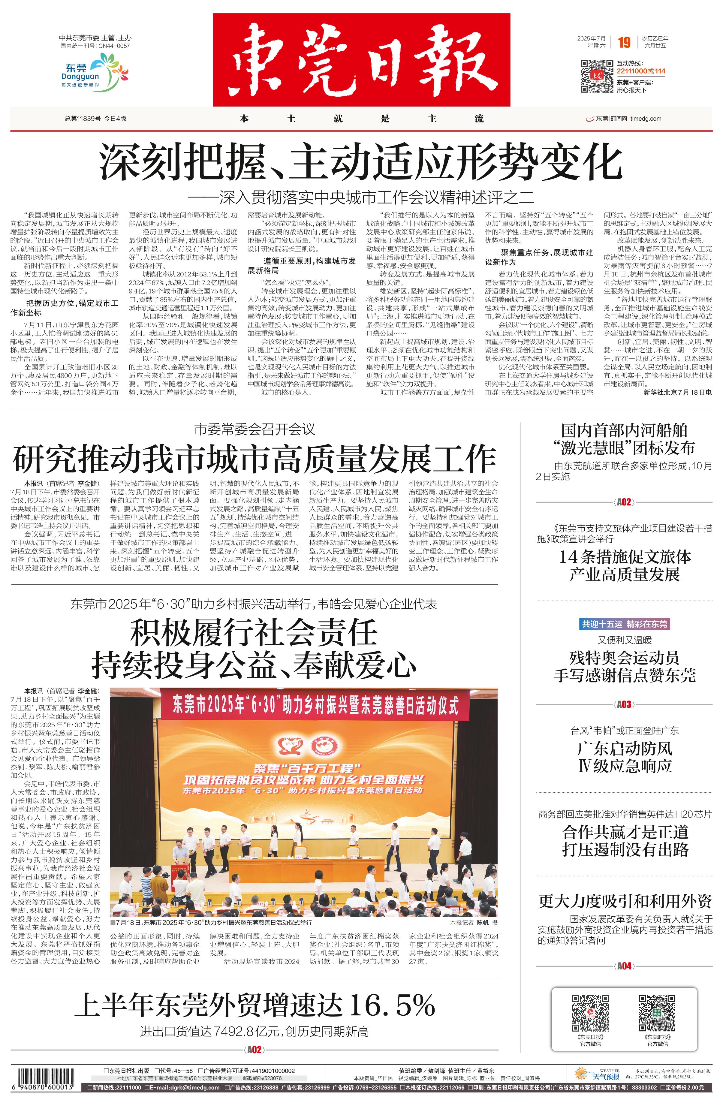 <div style='font-size: 16px!important;line-height: 28px!important;text-align: justify;color: #777!important;'>市委常委会召开会议</div><div style='font-size: 22px!important;line-height: 34px!important;text-align: justify!important;color: #000!important'>研究推动我市城市高质量发展工作</div><div style='font-size: 14px!important;line-height: 22px!important;text-align: left!important;color: #777!important;margin-top: 20px;'>东莞日报  首席记者 李金健  2025-07-19</div><div><img id='paperImg' style='max-width: 100%;height: auto' src='//img.founderfx.cn/epaper/202507/19/f76c40b25651440a8500407fc6becbd8/1.jpg' alt='' class='page-img'/></div><p> 本报讯 7月18日下午,市委常委会召开会议,传达学习习近平总书记在中央城市工作会议上的重要讲话精神,研究我市贯彻意见。市委书记韦皓主持会议并讲话。</p><p> 会议强调,习近平总书记在中央城市工作会议上的重要讲话立意深远、内涵丰富,科学回答了城市发展为了谁、依靠谁以及建设什么样的城市、怎样建设城市等重大理论和实践问题,为我们做好新时代新征程的城市工作提供了根本遵循。要认真学习领会习近平总书记在中央城市工作会议上的重要讲话精神,切实把思想和行动统一到总书记、党中央关于做好城市工作的决策部署上来,深刻把握“五个转变、五个更加注重”的重要原则,加快建设创新、宜居、美丽、韧性、文明、智慧的现代化人民城市,不断开创城市高质量发展新局面。要强化规划引领、走内涵式发展之路,高质量编制“十五五”规划,持续优化城市空间结构、完善城镇空间格局,合理安排生产、生活、生态空间,进一步提高城市的综合承载能力。要坚持产城融合促进转型升级,立足产业基础、区位优势,加强城市工作对产业发展赋能,构建更具国际竞争力的现代化产业体系,因地制宜发展新质生产力。要坚持人民城市人民建、人民城市为人民,聚焦人民群众的需求,着力营造高品质生活空间,不断提升公共服务水平,加快建设文化强市,持续推动城市发展绿色低碳转型,为人民创造更加幸福美好的生活环境。要加快构建现代化城市安全管理体系,坚持以党建引领营造共建共治共享的社会治理格局,加强城市建筑全生命周期安全管理,进一步完善防灾减灾网络,确保城市安全有序运行。要坚持和加强党对城市工作的全面领导,各相关部门要加强协作配合,切实增强各类政策协同性,各镇街(园区)要加快转变工作理念、工作重心,凝聚形成做好新时代新征程城市工作强大合力。</p>