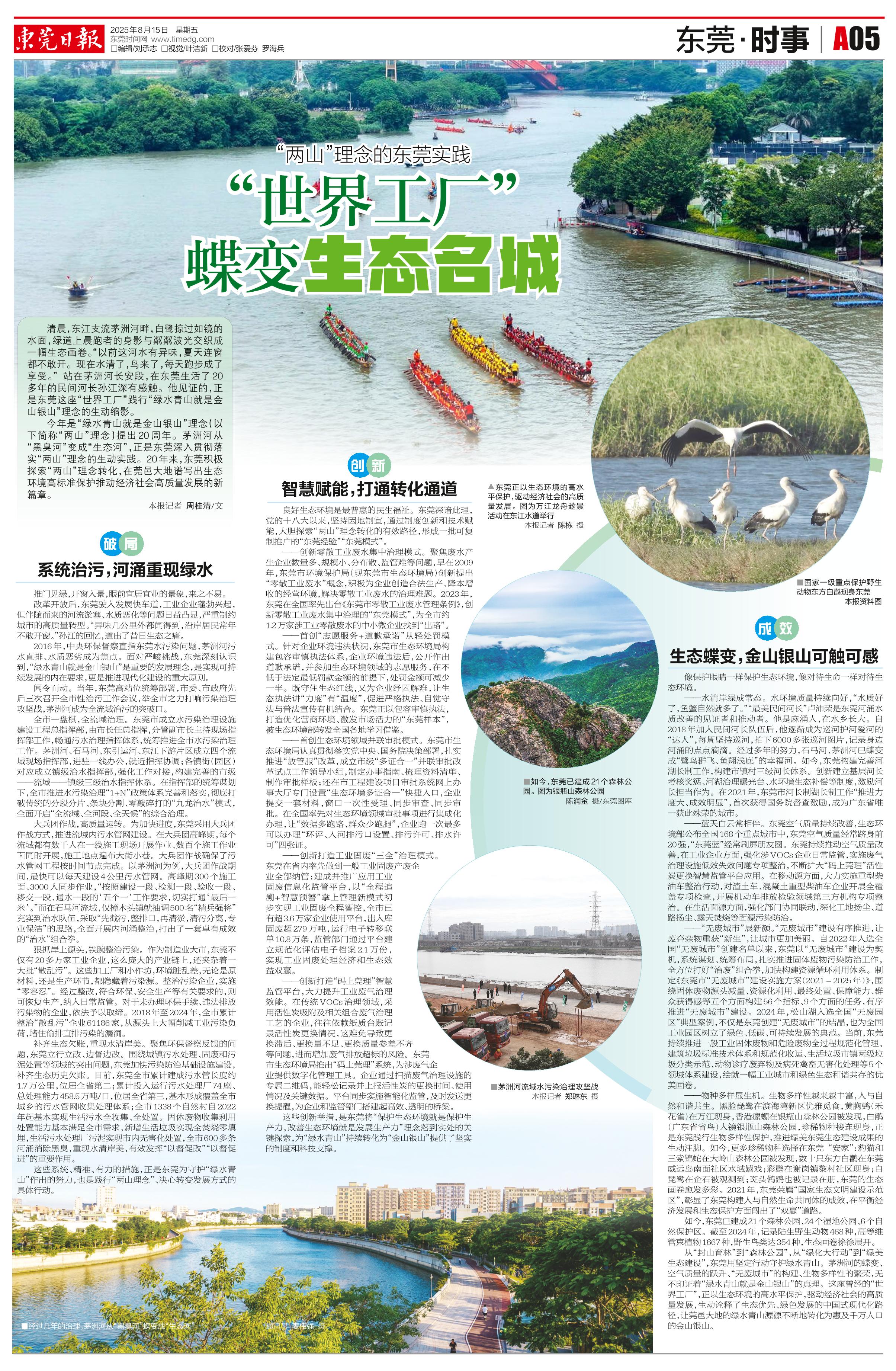 <div style='font-size: 16px!important;line-height: 28px!important;text-align: justify;color: #777!important;'>“两山”理念的东莞实践</div><div style='font-size: 22px!important;line-height: 34px!important;text-align: justify!important;color: #000!important'>“世界工厂” 蝶变生态名城</div><div style='font-size: 14px!important;line-height: 22px!important;text-align: left!important;color: #777!important;margin-top: 20px;'>东莞日报  周桂清  2025-08-15</div><div><img id='paperImg' style='max-width: 100%;height: auto' src='//img.founderfx.cn/epaper/202508/15/b326033875304a9896f864f13699b2bf/5.jpg' alt='' class='page-img'/></div><div style='font-size: 14px!important;line-height: 22px!important;text-align: center!important;color: #777!important;'><img src='//img.founderfx.cn/epaper/202508/15/b326033875304a9896f864f13699b2bf/A05/3D8B849533187A09A158287534A9D24E_s.jpg'style='display: block!important;margin: auto!important;max-width: 100%!important;'/> 东莞正以生态环境的高水平保护,驱动经济社会的高质量发展。图为万江龙舟趁景活动在东江水道举行