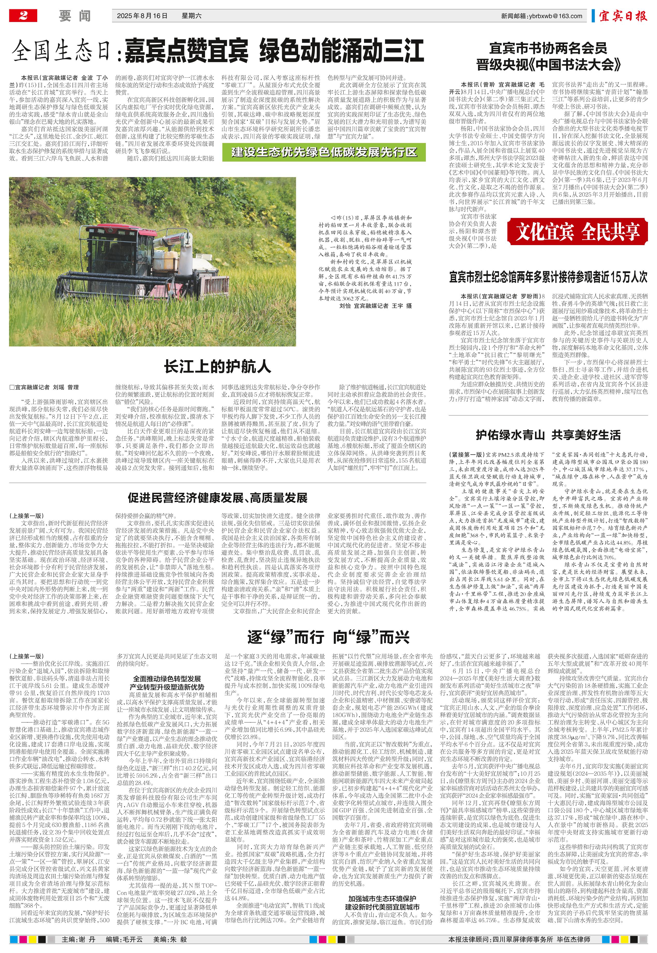 <div style='font-size: 22px!important;line-height: 34px!important;text-align: justify!important;color: #000!important'>图片新闻</div><div style='font-size: 14px!important;line-height: 22px!important;text-align: left!important;color: #777!important;margin-top: 20px;'>宜宾日报  2025-08-16</div><div><img id='paperImg' style='max-width: 100%;height: auto' src='//img.founderfx.cn/epaper/202508/15/33b204b8701046f08da23afca3cab23e/2.jpg' alt='' class='page-img'/></div><div style='font-size: 14px!important;line-height: 22px!important;text-align: center!important;color: #777!important;'><img src='//img.founderfx.cn/epaper/202508/15/33b204b8701046f08da23afca3cab23e/A2/2253562_maoky_1755251556359_s.jpg'style='display: block!important;margin: auto!important;max-width: 100%!important;'/></div><p> △昨(15)日,翠屏区李端镇新和村的稻田里一片丰收景象,联合收割机在田间往来穿梭,稻穗被精准卷入机器,收割、脱粒、秸秆粉碎等一气呵成。一粒粒饱满的稻谷顺着输送管落入粮箱,奏响了秋日丰收曲。</p><p> 新和村的变化,是翠屏区以机械化赋能农业发展的生动缩影。据了解,全区现有水稻种植面积41.75万亩,水稻联合收割机保有量达117台,今年预计实现机械化收割40万亩,节本增效达3062万元。</p><p> 刘怡 宜宾融媒记者 王宇 摄</p>