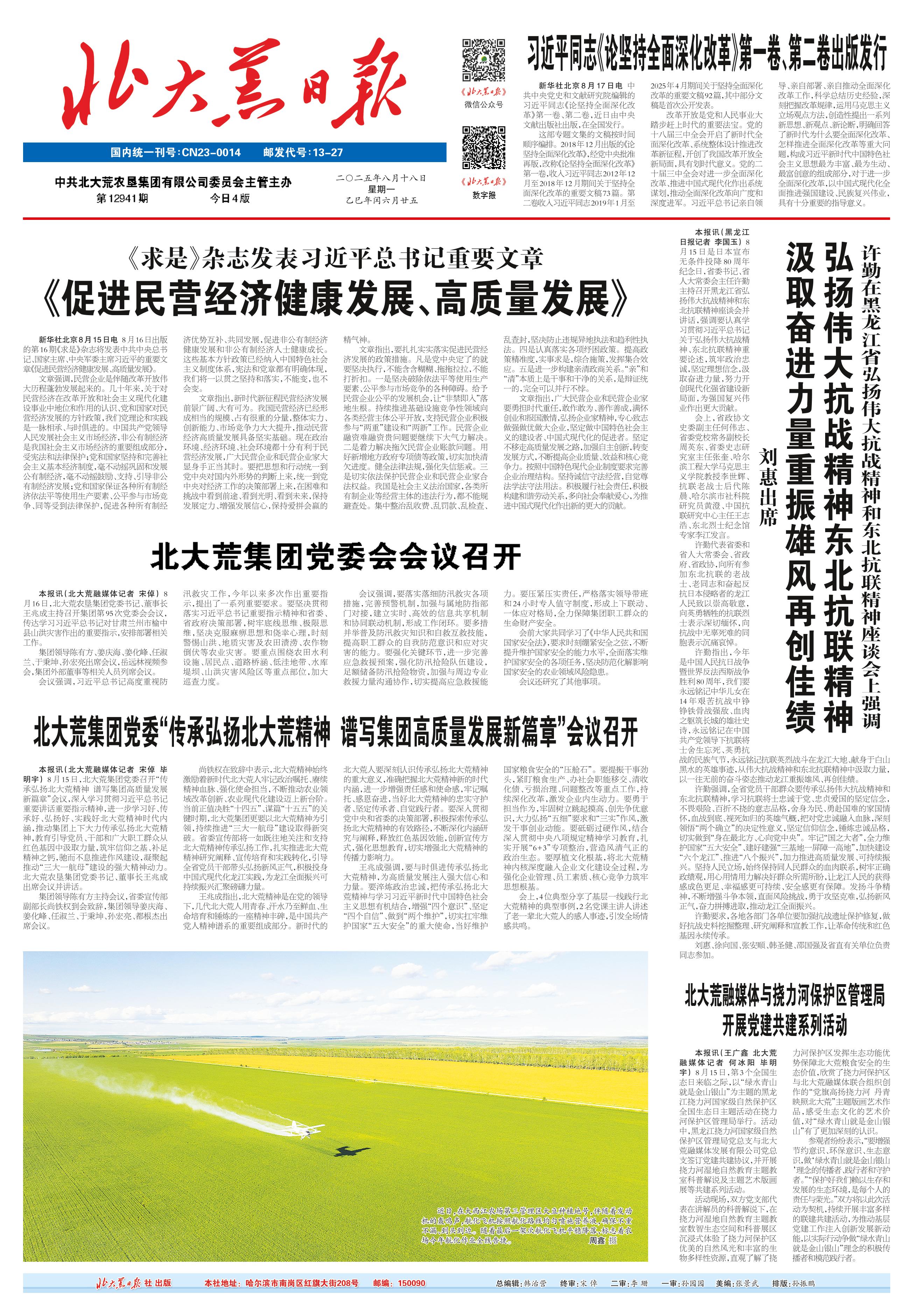 <div style='font-size: 22px!important;line-height: 34px!important;text-align: justify!important;color: #000!important'>北大荒集团党委“传承弘扬北大荒精神 谱写集团高质量发展新篇章”会议召开</div><div style='font-size: 14px!important;line-height: 22px!important;text-align: left!important;color: #777!important;margin-top: 20px;'>北大荒日报  2025-08-18</div><div><img id='paperImg' style='max-width: 100%;height: auto' src='//img.founderfx.cn/epaper/202508/17/cb7ca8ca06f04278bfbf59b2f634433a/3.jpg' alt='' class='page-img'/></div><p> 本报讯(北大荒融媒体记者 宋倬 毕明宇) 8月15日,北大荒集团党委召开“传承弘扬北大荒精神 谱写集团高质量发展新篇章”会议,深入学习贯彻习近平总书记重要讲话重要指示精神,进一步学习好、传承好、弘扬好、实践好北大荒精神时代内涵,推动集团上下大力传承弘扬北大荒精神,教育引导党员、干部和广大职工群众从红色基因中汲取力量,筑牢信仰之基、补足精神之钙,驰而不息推进作风建设,凝聚起推动“三大一航母”建设的强大精神动力。北大荒农垦集团党委书记、董事长王兆成出席会议并讲话。</p><p> 集团领导陈有方主持会议,省委宣传部副部长尚铁权到会致辞,集团领导姜庆海、姜化峰、任淑兰、于秉坤、孙宏亮、都根杰出席会议。</p><p> 尚铁权在致辞中表示,北大荒精神始终激励着新时代北大荒人牢记政治嘱托、赓续精神血脉、强化使命担当,不断推动农业领域改革创新、农业现代化建设迈上新台阶。当前正值决胜“十四五”、谋篇“十五五”的关键时期,北大荒集团更要以北大荒精神为引领,持续推进“三大一航母”建设取得新突破。省委宣传部将一如既往地关注和支持北大荒精神传承弘扬工作,扎实推进北大荒精神研究阐释、宣传培育和实践转化,引导全省党员干部带头弘扬新风正气,积极投身中国式现代化龙江实践,为龙江全面振兴可持续振兴汇聚磅礴力量。</p><p> 王兆成指出,北大荒精神是在党的领导下,几代北大荒人用青春、汗水乃至鲜血、生命培育和锤炼的一座精神丰碑,是中国共产党人精神谱系的重要组成部分。新时代的北大荒人要深刻认识传承弘扬北大荒精神的重大意义,准确把握北大荒精神新的时代内涵,进一步增强责任感和使命感,牢记嘱托、感恩奋进,当好北大荒精神的忠实守护者、坚定传承者、自觉践行者。要深入贯彻党中央和省委的决策部署,积极探索传承弘扬北大荒精神的有效路径,不断深化内涵研究与阐释,释放红色基因效能,创新宣传方式,强化思想教育,切实增强北大荒精神的传播力影响力。</p><p> 王兆成强调,要与时俱进传承弘扬北大荒精神,为高质量发展注入强大信心和力量。要淬炼政治忠诚,把传承弘扬北大荒精神与学习习近平新时代中国特色社会主义思想有机结合,增强“四个意识”、坚定“四个自信”、做到“两个维护”,切实扛牢维护国家“五大安全”的重大使命,当好维护国家粮食安全的“压舱石”。要提振干事劲头,紧盯粮食生产、办社会职能移交、清收化债、亏损治理、问题整改等重点工作,持续深化改革,激发企业内生动力。要勇于担当作为,牢固树立跳起摸高、创先争优意识,大力弘扬“五细”要求和“三实”作风,激发干事创业动能。要砥砺过硬作风,结合深入贯彻中央八项规定精神学习教育,扎实开展“6+3”专项整治,营造风清气正的政治生态。要厚植文化根基,将北大荒精神内核深度融入企业文化建设全过程,为强化企业管理、员工素质、核心竞争力筑牢思想根基。</p><p> 会上,4位典型分享了基层一线践行北大荒精神的典型事例,2名党课主讲人讲述了老一辈北大荒人的感人事迹,引发全场情感共鸣。</p>