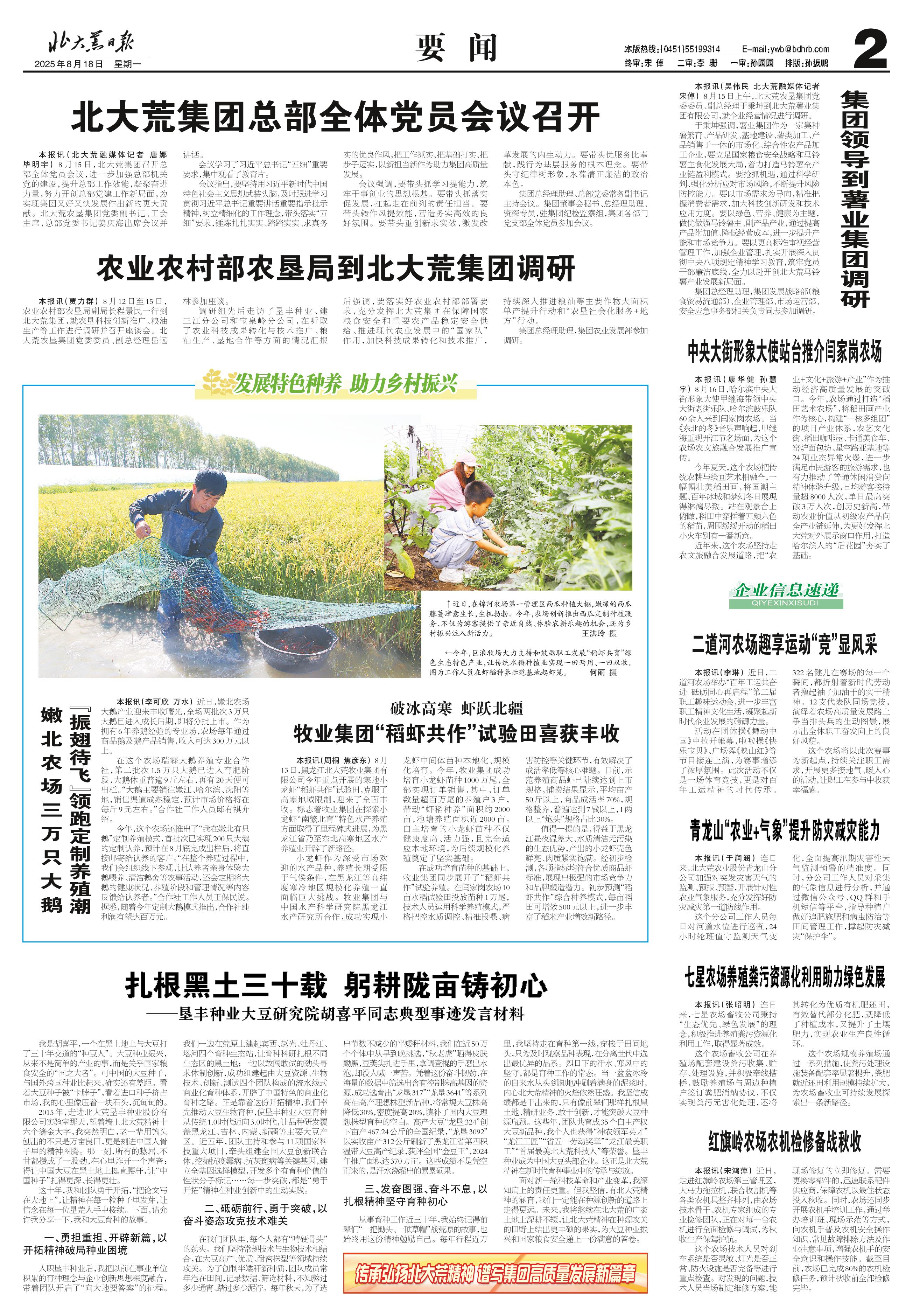 <div style='font-size: 22px!important;line-height: 34px!important;text-align: justify!important;color: #000!important'>北大荒集团总部全体党员会议召开</div><div style='font-size: 14px!important;line-height: 22px!important;text-align: left!important;color: #777!important;margin-top: 20px;'>北大荒日报  2025-08-18</div><div><img id='paperImg' style='max-width: 100%;height: auto' src='//img.founderfx.cn/epaper/202508/17/cb7ca8ca06f04278bfbf59b2f634433a/4.jpg' alt='' class='page-img'/></div><p> 本报讯(北大荒融媒体记者 唐娜 毕明宇) 8月15日,北大荒集团召开总部全体党员会议,进一步加强总部机关党的建设,提升总部工作效能,凝聚奋进力量,努力开创总部党建工作新局面,为实现集团又好又快发展作出新的更大贡献。北大荒农垦集团党委副书记、工会主席,总部党委书记姜庆海出席会议并讲话。</p><p> 会议学习了习近平总书记“五细”重要要求,集中观看了教育片。</p><p> 会议指出,要坚持用习近平新时代中国特色社会主义思想武装头脑,及时跟进学习贯彻习近平总书记重要讲话重要指示批示精神,树立精细化的工作理念,带头落实“五细”要求,锤炼扎扎实实、踏踏实实、求真务实的优良作风,把工作抓实、把基础打实、把步子迈实,以新担当新作为助力集团高质量发展。</p><p> 会议强调,要带头抓学习提能力,筑牢干事创业的思想根基。要带头抓落实促发展,扛起走在前列的责任担当。要带头转作风提效能,营造务实高效的良好氛围。要带头重创新求实效,激发改革发展的内生动力。要带头优服务比奉献,践行为基层服务的根本理念。要带头守纪律树形象,永葆清正廉洁的政治本色。</p><p> 集团总经理助理、总部党委常务副书记主持会议。集团董事会秘书、总经理助理、资深专员,驻集团纪检监察组,集团各部门党支部全体党员参加会议。</p>