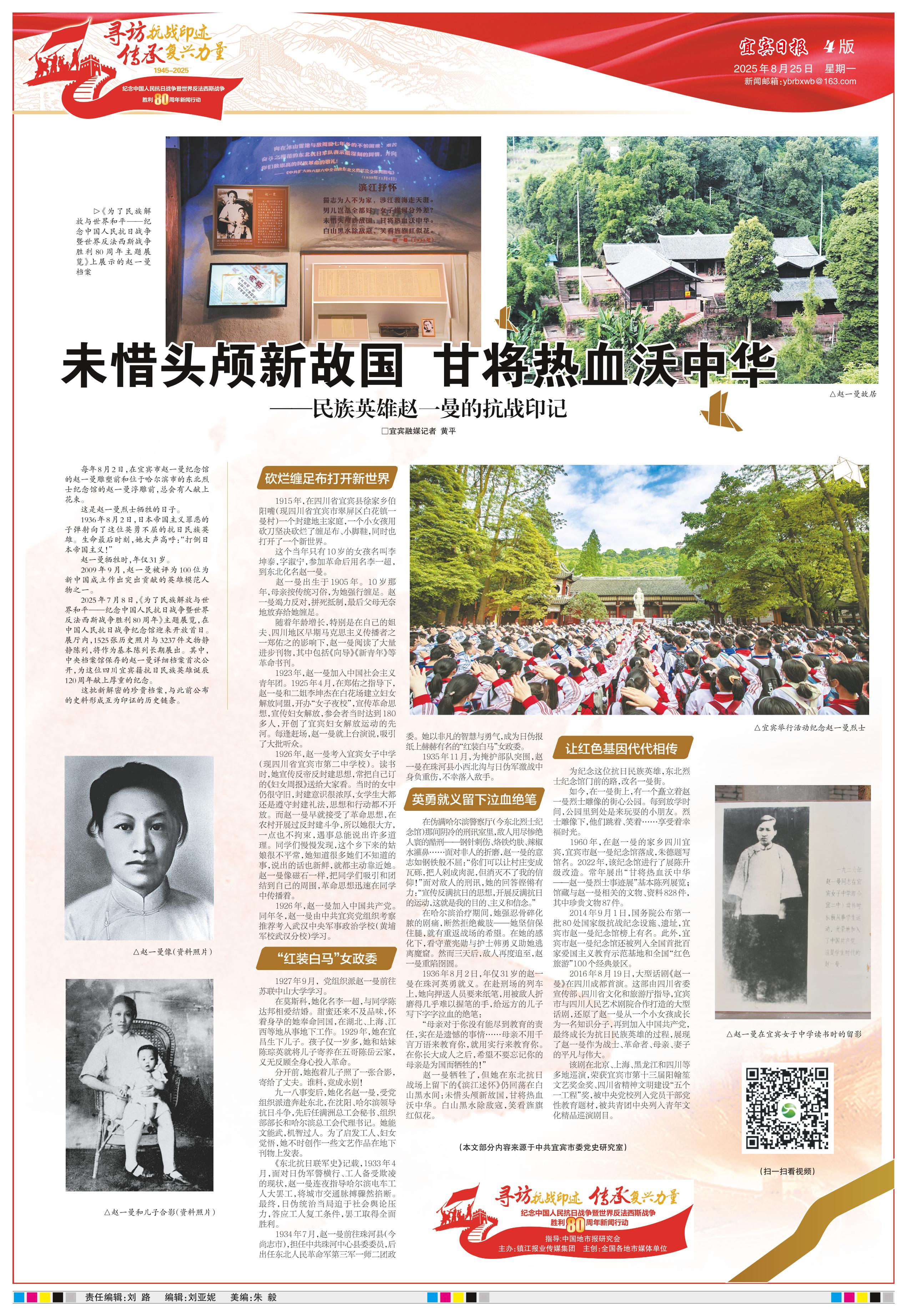 <div style='font-size: 22px!important;line-height: 34px!important;text-align: justify!important;color: #000!important'>未惜头颅新故国 甘将热血沃中华</div><div style='font-size: 16px!important;line-height: 28px!important;text-align: justify;color: #777!important;margin-top: 20px;'>——民族英雄赵一曼的抗战印记</div><div style='font-size: 14px!important;line-height: 22px!important;text-align: left!important;color: #777!important;margin-top: 20px;'>宜宾日报  2025-08-25</div><div><img id='paperImg' style='max-width: 100%;height: auto' src='//img.founderfx.cn/epaper/202508/25/429b002871d54775a323d95ebf9ff3ae/4.jpg' alt='' class='page-img'/></div><div style='font-size: 14px!important;line-height: 22px!important;text-align: center!important;color: #777!important;'><img src='//img.founderfx.cn/epaper/202508/25/429b002871d54775a323d95ebf9ff3ae/A4/2254722_liuyn_1755480858220_s.jpg'style='display: block!important;margin: auto!important;max-width: 100%!important;'/> △《为了民族解放与世界和平——纪念中国人民抗日战争暨世界反法西斯战争胜利80周年主题展览》上展示的赵一曼档案<img src='//img.founderfx.cn/epaper/202508/25/429b002871d54775a323d95ebf9ff3ae/A4/2254717_liuyn_1755480857129_s.jpg'style='display: block!important;margin: auto!important;max-width: 100%!important;'/> △赵一曼故居<img src='//img.founderfx.cn/epaper/202508/25/429b002871d54775a323d95ebf9ff3ae/A4/2255400_liuyn_1755597892727_s.jpg'style='display: block!important;margin: auto!important;max-width: 100%!important;'/> △宜宾举行活动纪念赵一曼烈士<img src='//img.founderfx.cn/epaper/202508/25/429b002871d54775a323d95ebf9ff3ae/A4/2254720_liuyn_1755480857890_s.jpg'style='display: block!important;margin: auto!important;max-width: 100%!important;'/> △赵一曼像(资料照片)<img src='//img.founderfx.cn/epaper/202508/25/429b002871d54775a323d95ebf9ff3ae/A4/2254721_liuyn_1755480858070_s.jpg'style='display: block!important;margin: auto!important;max-width: 100%!important;'/> △赵一曼和儿子合影(资料照片)<img src='//img.founderfx.cn/epaper/202508/25/429b002871d54775a323d95ebf9ff3ae/A4/2254718_liuyn_1755480857386_s.jpg'style='display: block!important;margin: auto!important;max-width: 100%!important;'/> △赵一曼在宜宾女子中学读书时的留影<img src='//img.founderfx.cn/epaper/202508/25/429b002871d54775a323d95ebf9ff3ae/A4/扫一扫看视频_s.jpg'style='display: block!important;margin: auto!important;max-width: 100%!important;'/> (扫一扫看视频)</div><p> □宜宾融媒记者 黄平</p><p> 每年8月2日,在宜宾市赵一曼纪念馆的赵一曼雕塑前和位于哈尔滨市的东北烈士纪念馆的赵一曼浮雕前,总会有人献上花束。</p><p> 这是赵一曼烈士牺牲的日子。</p><p> 1936年8月2日,日本帝国主义罪恶的子弹射向了这位英勇不屈的抗日民族英雄。生命最后时刻,她大声高呼:“打倒日本帝国主义!”</p><p> 赵一曼牺牲时,年仅31岁。</p><p> 2009年9月,赵一曼被评为100位为新中国成立作出突出贡献的英雄模范人物之一。</p><p> 2025年7月8日,《为了民族解放与世界和平——纪念中国人民抗日战争暨世界反法西斯战争胜利80周年》主题展览,在中国人民抗日战争纪念馆迎来开放首日。展厅内,1525张历史照片与3237件文物静静陈列,将作为基本陈列长期展出。其中,中央档案馆保存的赵一曼详细档案首次公开,为这位四川宜宾籍抗日民族英雄诞辰120周年献上厚重的纪念。</p><p> 这批新解密的珍贵档案,与此前公布的史料形成互为印证的历史链条。</p><p> 砍烂缠足布打开新世界</p><p> 1915年,在四川省宜宾县徐家乡伯阳嘴(现四川省宜宾市翠屏区白花镇一曼村)一个封建地主家庭,一个小女孩用砍刀坚决砍烂了缠足布、小脚鞋,同时也打开了一个新世界。</p><p> 这个当年只有10岁的女孩名叫李坤泰,字淑宁,参加革命后用名李一超,到东北化名赵一曼。</p><p> 赵一曼出生于1905年。10岁那年,母亲按传统习俗,为她强行缠足。赵一曼竭力反对,拼死抵制,最后父母无奈地放弃给她缠足。</p><p> 随着年龄增长,特别是在自己的姐夫、四川地区早期马克思主义传播者之一郑佑之的影响下,赵一曼阅读了大量进步刊物,其中包括《向导》《新青年》等革命书刊。</p><p> 1923年,赵一曼加入中国社会主义青年团。1925年4月,在郑佑之指导下,赵一曼和二姐李坤杰在白花场建立妇女解放同盟,开办“女子夜校”,宣传革命思想,宣传妇女解放,参会者当时达到180多人,开创了宜宾妇女解放运动的先河。每逢赶场,赵一曼就上台演说,吸引了大批听众。</p><p> 1926年,赵一曼考入宜宾女子中学(现四川省宜宾市第二中学校)。读书时,她宣传反帝反封建思想,常把自己订的《妇女周报》送给大家看。当时的女中仍很守旧,封建意识很浓厚,女学生大都还是遵守封建礼法,思想和行动都不开放。而赵一曼早就接受了革命思想,在农村开展过反封建斗争,所以她很大方,一点也不拘束,遇事总能说出许多道理。同学们慢慢发现,这个乡下来的姑娘很不平常,她知道很多她们不知道的事,说出的话也新鲜,就都主动靠近她。赵一曼像磁石一样,把同学们吸引和团结到自己的周围,革命思想迅速在同学中传播着。</p><p> 1926年,赵一曼加入中国共产党。同年冬,赵一曼由中共宜宾党组织考察推荐考入武汉中央军事政治学校(黄埔军校武汉分校)学习。</p><p> “红装白马”女政委</p><p> 1927年9月, 党组织派赵一曼前往苏联中山大学学习。</p><p> 在莫斯科,她化名李一超,与同学陈达邦相爱结婚。甜蜜还来不及品味,怀着身孕的她奉命回国,在湖北、上海、江西等地从事地下工作。1929