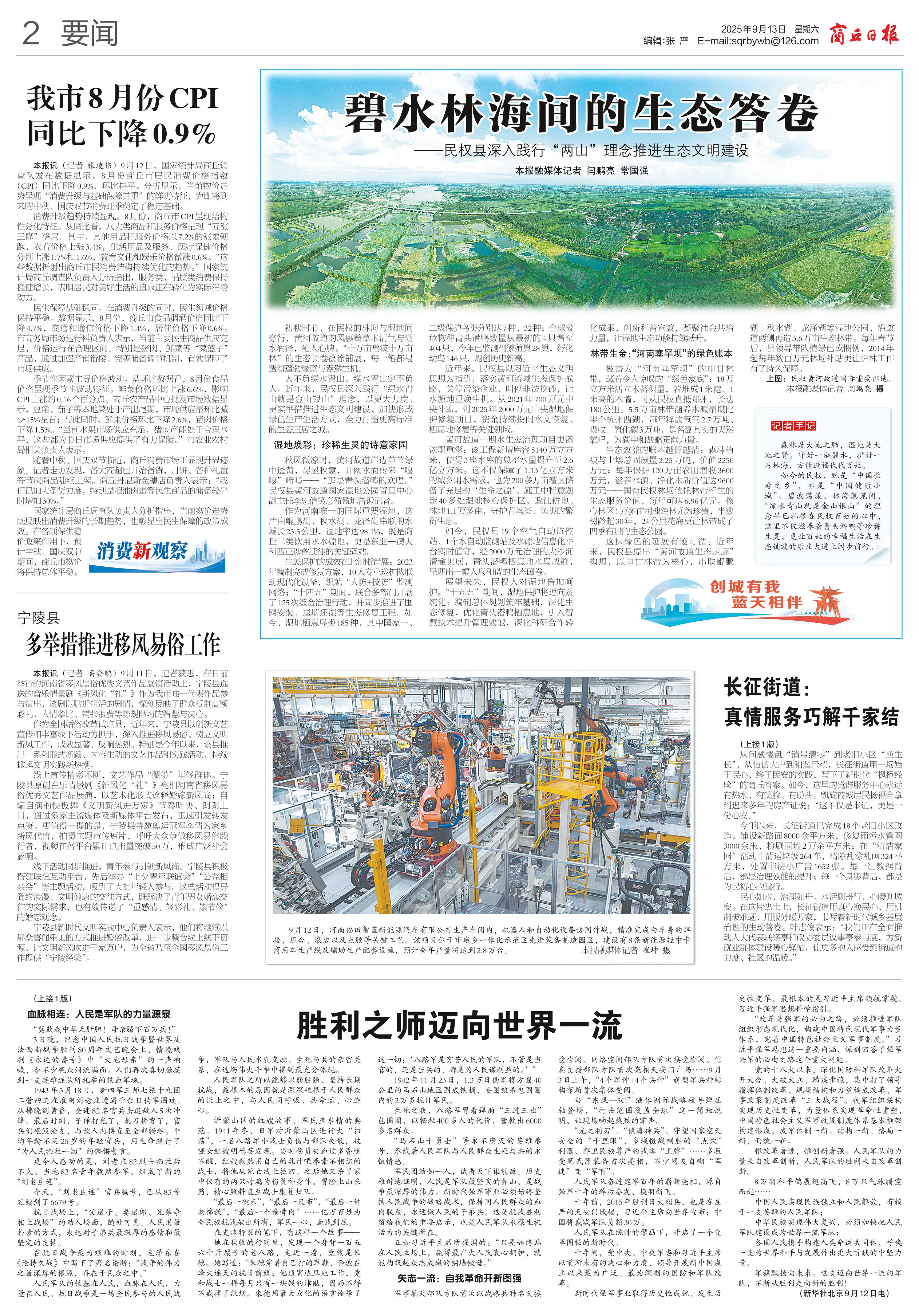 <div style='font-size: 22px!important;line-height: 34px!important;text-align: justify!important;color: #000!important'>碧水林海间的生态答卷</div><div style='font-size: 16px!important;line-height: 28px!important;text-align: justify;color: #777!important;margin-top: 20px;'>——民权县深入践行“两山”理念推进生态文明建设</div><div style='font-size: 14px!important;line-height: 22px!important;text-align: left!important;color: #777!important;margin-top: 20px;'>商丘日报云阅读  本报融媒体记者 闫鹏亮 常国强  2025-09-13</div><div><img id='paperImg' style='max-width: 100%;height: auto' src='//img.founderfx.cn/epaper/202509/13/fc30d749624c498f8f0e169a887e310f/2.jpg' alt='' class='page-img'/></div><div style='font-size: 14px!important;line-height: 22px!important;text-align: center!important;color: #777!important;'><img src='//img.founderfx.cn/epaper/202509/13/fc30d749624c498f8f0e169a887e310f/02/2978708_gm_1757684924145_s.jpg'style='display: block!important;margin: auto!important;max-width: 100%!important;'/> 上图:民权黄河故道国际重要湿地。本报融媒体记者 闫鹏亮 摄</div><p> 初秋时节,在民权的林海与湿地间穿行,黄河故道的风裹着草木清气与湖水润泽,沁人心脾。“十万亩碧波十万亩林”的生态长卷徐徐铺展,每一笔都浸透着蓬勃绿意与盎然生机。</p><p> 人不负绿水青山,绿水青山定不负人。近年来,民权县深入践行“绿水青山就是金山银山”理念,以更大力度、更实举措推进生态文明建设,加快形成绿色生产生活方式,全力打造更高标准的生态宜居之城。</p><p> 湿地焕彩:珍稀生灵的诗意家园</p><p> 秋风微凉时,黄河故道岸边芦苇绿中透黄,尽显秋意,开阔水面传来“嘎嘎”啼鸣——“那是青头潜鸭的欢唱。”民权县黄河故道国家湿地公园管理中心副主任李忠信笑意盈盈地告诉记者。</p><p> 作为河南唯一的国际重要湿地,这片由鲲鹏湖、秋水湖、龙泽湖串联的水域长23.5公里,湿地率达98.1%,既是商丘二类饮用水水源地,更是东亚—澳大利西亚涉禽迁徙的关键驿站。</p><p> 生态保护的成效在此清晰铺展:2023年编制完成修复方案,10人专业巡护队联动现代化设备,织就“人防+技防”监测网络;“十四五”期间,联合多部门开展了125次综合治理行动,并同步推进了围网安装、退塘还湿等生态修复工程。如今,湿地栖息鸟类185种,其中国家一、二级保护鸟类分别达7种、32种;全球极危物种青头潜鸭数量从最初的4只增至404只,今年已监测到繁殖巢28巢,孵化幼鸟146只,均创历史新高。</p><p> 近年来,民权县以习近平生态文明思想为指引,落实黄河流域生态保护战略,关停污染企业、叫停非法挖砂,让水源地重焕生机。从2021年700万元中央补助,到2025年2000万元中央湿地保护修复项目,资金持续投向水文恢复、栖息地修复等关键领域。</p><p> 黄河故道一期水生态治理项目更添浓墨重彩:该工程新增库容5140万立方米,使得3座水库的总蓄水量提升至2.6亿立方米。这不仅保障了1.13亿立方米的城乡用水需求,也为200多万亩灌区储备了充足的‘生命之源’。施工中特意划定40多处湿地核心保护区,避让耕地、林地1.1万多亩,守护着鸟类、鱼类的繁衍生息。</p><p> 如今,民权县19个空气自动监控站、1个水自动监测站及水源地信息化平台实时值守,经2000万元治理的大沙河清澈见底,青头潜鸭栖息地水鸟成群,呈现出一幅人鸟和谐的生态画卷。</p><p> 展望未来,民权人对湿地倍加呵护。“十五五”期间,湿地保护将迈向系统化:编制总体规划筑牢基础,深化生态修复,优化青头潜鸭栖息地,引入智慧技术提升管理效能,深化科研合作转化成果,创新科普宣教,凝聚社会共治力量,让湿地生态功能持续跃升。</p><p> 林带生金:“河南塞罕坝”的绿色账本</p><p> 被誉为“河南塞罕坝”的申甘林带,藏着令人惊叹的“绿色家底”:18万立方米活立木蓄积量,若堆成1米宽、1米高的木墙,可从民权直抵郑州,长达180公里。5.5万亩林带涵养水源量堪比半个杭州西湖,每年释放氧气2.7万吨、吸收二氧化碳3万吨,是名副其实的天然氧吧,为碳中和战略贡献力量。</p><p> 生态效益的账本越算越清:森林植被与土壤总固碳量2.25万吨,价值2250万元;每年保护120万亩农田增收3600万元,涵养水源、净化水质价值达9600万元——国有民权林场依托林带衍生的生态服务价值,每年可达6.96亿元。核心林区1万多亩刺槐纯林尤为珍贵,半数树龄超30年,24公里花海更让林带成了四季有景的生态公园。</p><p> 这抹绿色的延展有迹可循:近年来,民权县提出“黄河故道生态走廊”构想,以申甘林带为核心,串联鲲鹏湖、秋水湖、龙泽湖等湿地公园,沿故道两侧再造3.6万亩生态林带。每年春节后,县领导带队植绿已成惯例,2014年起每年数百万元林场补贴更让护林工作有了持久保障。</p><p> 记者手记</p><p> 森林是大地之肺,湿地是大地之肾。守好一泓碧水,护好一片林海,方能造福代代百姓。</p><p> 如今的民权,既是“中国长寿之乡”,亦是“中国健康小城”。碧波荡漾、林海葱茏间,“绿水青山就是金山银山”的理念早已扎根在民权百姓的心中,这里不仅滋养着青头潜鸭等珍稀生灵,更让百姓的幸福生活在生态铺就的康庄大道上阔步前行。</p>