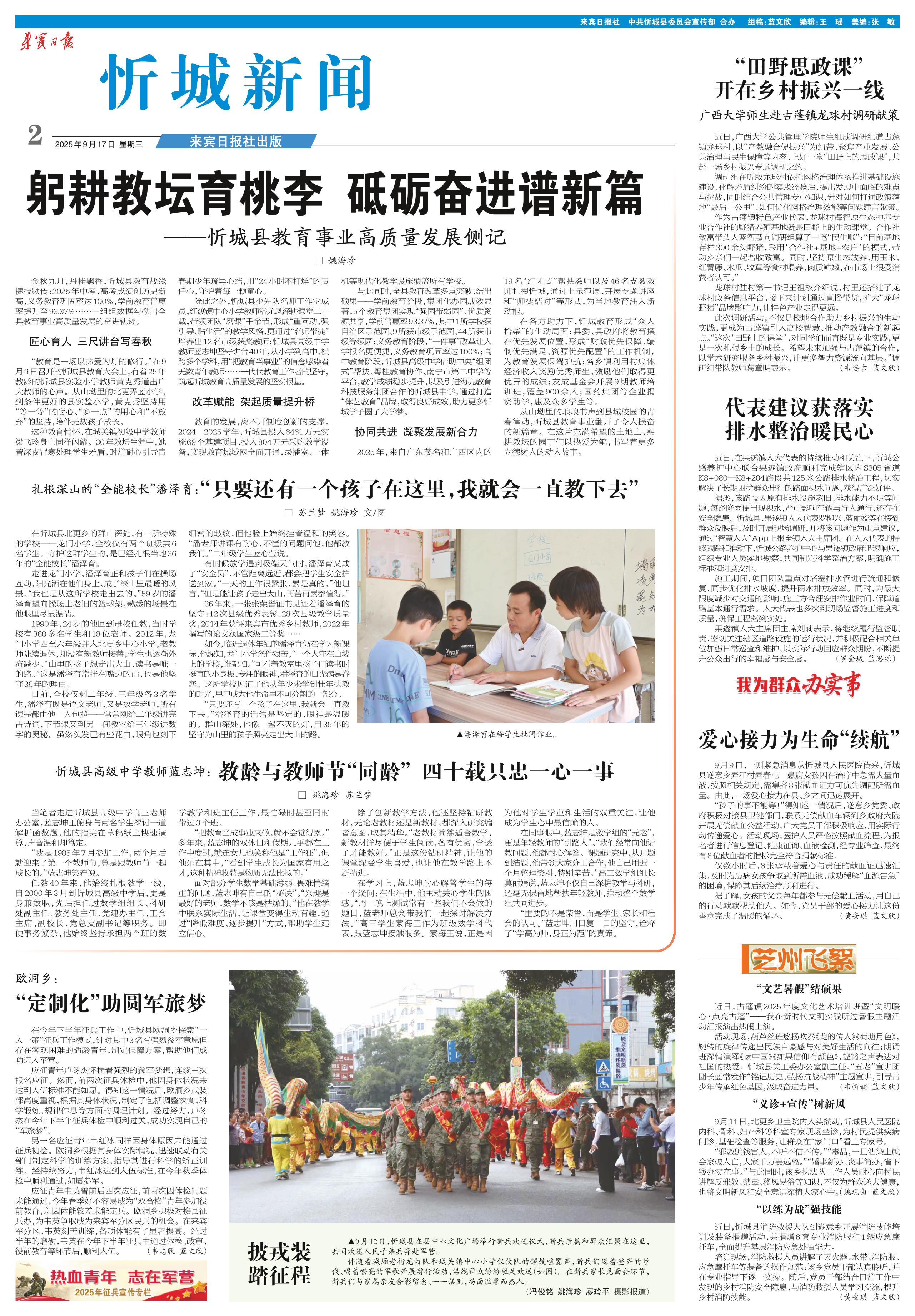 <div style='font-size: 22px!important;line-height: 34px!important;text-align: justify!important;color: #000!important'>躬耕教坛育桃李 砥砺奋进谱新篇</div><div style='font-size: 16px!important;line-height: 28px!important;text-align: justify;color: #777!important;margin-top: 20px;'>——忻城县教育事业高质量发展侧记</div><div style='font-size: 14px!important;line-height: 22px!important;text-align: left!important;color: #777!important;margin-top: 20px;'>来宾日报  □ 姚海珍  2025-09-17</div><div><img id='paperImg' style='max-width: 100%;height: auto' src='//img.founderfx.cn/epaper/202509/19/9573ac52b51149fab87531b470f19f47/2.jpg' alt='' class='page-img'/></div><p> 金秋九月,丹桂飘香,忻城县教育战线捷报频传:2025年中考、高考成绩创历史新高,义务教育巩固率达100%,学前教育普惠率提升至93.37%……一组组数据勾勒出全县教育事业高质量发展的奋进轨迹。</p><p> 匠心育人 三尺讲台写春秋</p><p> “教育是一场以热爱为灯的修行。”在9月9日召开的忻城县教育大会上,有着25年教龄的忻城县实验小学教师黄克秀道出广大教师的心声。从山坳里的北更弄蓝小学,到条件更好的县实验小学,黄克秀坚持用“等一等”的耐心、“多一点”的用心和“不放弃”的坚持,陪伴无数孩子成长。</p><p> 这种教育情怀,在城关镇初级中学教师梁飞玲身上同样闪耀。30年教坛生涯中,她曾深夜冒寒处理学生矛盾、时常耐心引导青春期少年疏导心结,用“24小时不打烊”的责任心,守护着每一颗童心。</p><p> 除此之外,忻城县少先队名师工作室成员、红渡镇中心小学教师潘尤凤深耕课堂二十载,带领团队“磨课”千余节,形成“重互动、强引导、贴生活”的教学风格,更通过“名师带徒”培养出12名市级获奖教师;忻城县高级中学教师蓝志坤坚守讲台40年,从小学到高中、横跨多个学科,用“把教育当事业”的信念感染着无数青年教师……一代代教育工作者的坚守,筑起忻城教育高质量发展的坚实根基。</p><p> 改革赋能 架起质量提升桥</p><p> 教育的发展,离不开制度创新的支撑。2024—2025学年,忻城县投入6461万元实施69个基建项目,投入804万元采购教学设备,实现教育城域网全面开通,录播室、一体机等现代化教学设施覆盖所有学校。</p><p> 与此同时,全县教育改革多点突破、结出硕果——学前教育阶段,集团化办园成效显著,5个教育集团实现“强园带弱园”、优质资源共享,学前普惠率93.37%,其中1所学校获自治区示范园、9所获市级示范园、44所获市级等级园;义务教育阶段,“一件事”改革让入学报名更便捷,义务教育巩固率达100%;高中教育阶段,忻城县高级中学借助中央“组团式”帮扶、粤桂教育协作、南宁市第二中学等平台,教学成绩稳步提升,以及引进海亮教育科技服务集团合作的忻城县中学,通过打造“体艺教育”品牌,取得良好成效,助力更多忻城学子圆了大学梦。</p><p> 协同共进 凝聚发展新合力</p><p> 2025年,来自广东茂名和广西区内的19名“组团式”帮扶教师以及46名支教教师扎根忻城,通过上示范课、开展专题讲座和“师徒结对”等形式,为当地教育注入新动能。</p><p> 在各方助力下,忻城教育形成“众人拾柴”的生动局面:县委、县政府将教育摆在优先发展位置,形成“财政优先保障、编制优先满足、资源优先配置”的工作机制,为教育发展保驾护航;各乡镇利用村集体经济收入奖励优秀师生,激励他们取得更优异的成绩;友成基金会开展9期教师培训班,覆盖900余人;国药集团等企业捐资助学,惠及众多学生等。</p><p> 从山坳里的琅琅书声到县城校园的青春律动,忻城县教育事业翻开了令人振奋的新篇章。在这片充满希望的土地上,躬耕教坛的园丁们以热爱为笔,书写着更多立德树人的动人故事。</p>