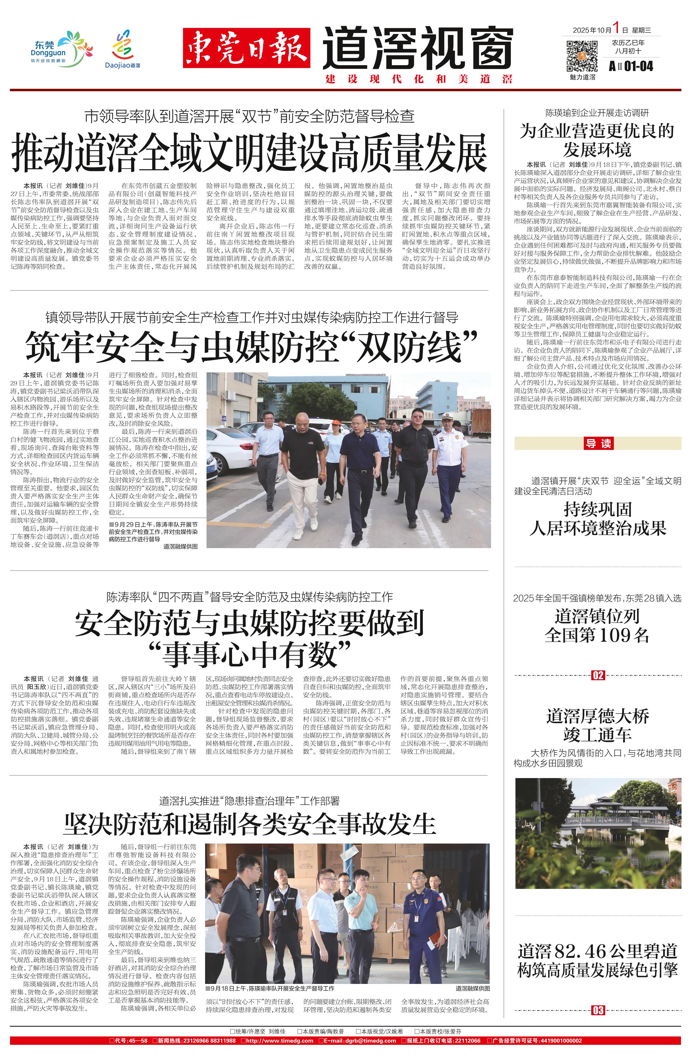 <div style='font-size: 16px!important;line-height: 28px!important;text-align: justify;color: #777!important;'>道滘扎实推进“隐患排查治理年”工作部署</div><div style='font-size: 22px!important;line-height: 34px!important;text-align: justify!important;color: #000!important'>坚决防范和遏制各类安全事故发生</div><div style='font-size: 14px!important;line-height: 22px!important;text-align: left!important;color: #777!important;margin-top: 20px;'>东莞日报  记者 刘维佳  2025-10-01</div><div><img id='paperImg' style='max-width: 100%;height: auto' src='//img.founderfx.cn/epaper/202510/01/936e8df3beff4044adc9185eb41a61f4/13.jpg' alt='' class='page-img'/></div><div style='font-size: 14px!important;line-height: 22px!important;text-align: center!important;color: #777!important;'><img src='//img.founderfx.cn/epaper/202510/01/936e8df3beff4044adc9185eb41a61f4/E01/20169968_sm1_1759147272645_s.jpg'style='display: block!important;margin: auto!important;max-width: 100%!important;'/> ■9月18日上午,陈瑛瑜率队开展安全生产督导工作 道滘融媒供图</div><p> 本报讯 为深入推进“隐患排查治理年”工作部署,全面强化消防安全综合治理,切实保障人民群众生命财产安全,9月18日上午,道滘镇党委副书记、镇长陈瑛瑜,镇党委副书记梁沃滔带队深入辖区农批市场、企业和酒店,开展安全生产督导工作。镇应急管理分局、消防大队、市场监管、经济发展局等相关负责人参加检查。</p><p> 在八汇农批市场,督导组重点对市场内的安全管理制度落实、消防设施配备运行、用电用气规范、疏散通道等情况进行了检查,了解市场日常监管及市场主体安全管理责任落实情况。</p><p> 陈瑛瑜强调,农批市场人员密集、货物众多,必须时刻绷紧安全这根弦,严格落实各项安全措施,严防火灾等事故发生。</p><p> 随后,督导组一行前往东莞市尊弛智能设备科技有限公司。在该企业,督导组深入生产车间,重点检查了粉尘涉爆场所的安全操作规程、消防设施设备等情况。针对检查中发现的问题,要求企业负责人认真落实整改措施,由相关部门安排专人跟踪督促企业落实整改情况。</p><p> 陈瑛瑜强调,企业负责人必须牢固树立安全发展理念,深刻吸取相关事故教训,加大安全投入,彻底排查安全隐患,筑牢安全生产防线。</p><p> 最后,督导组来到维也纳三好酒店,对其消防安全综合治理情况进行督导。检查内容包括消防设施维护保养、疏散指示标志和应急照明是否完好有效、员工是否掌握基本消防技能等。</p><p> 陈瑛瑜强调,各相关单位必须以“时时放心不下”的责任感,持续深化隐患排查治理,对发现的问题要建立台账、限期整改、闭环管理,坚决防范和遏制各类安全事故发生,为道滘经济社会高质量发展营造安全稳定的环境。</p>