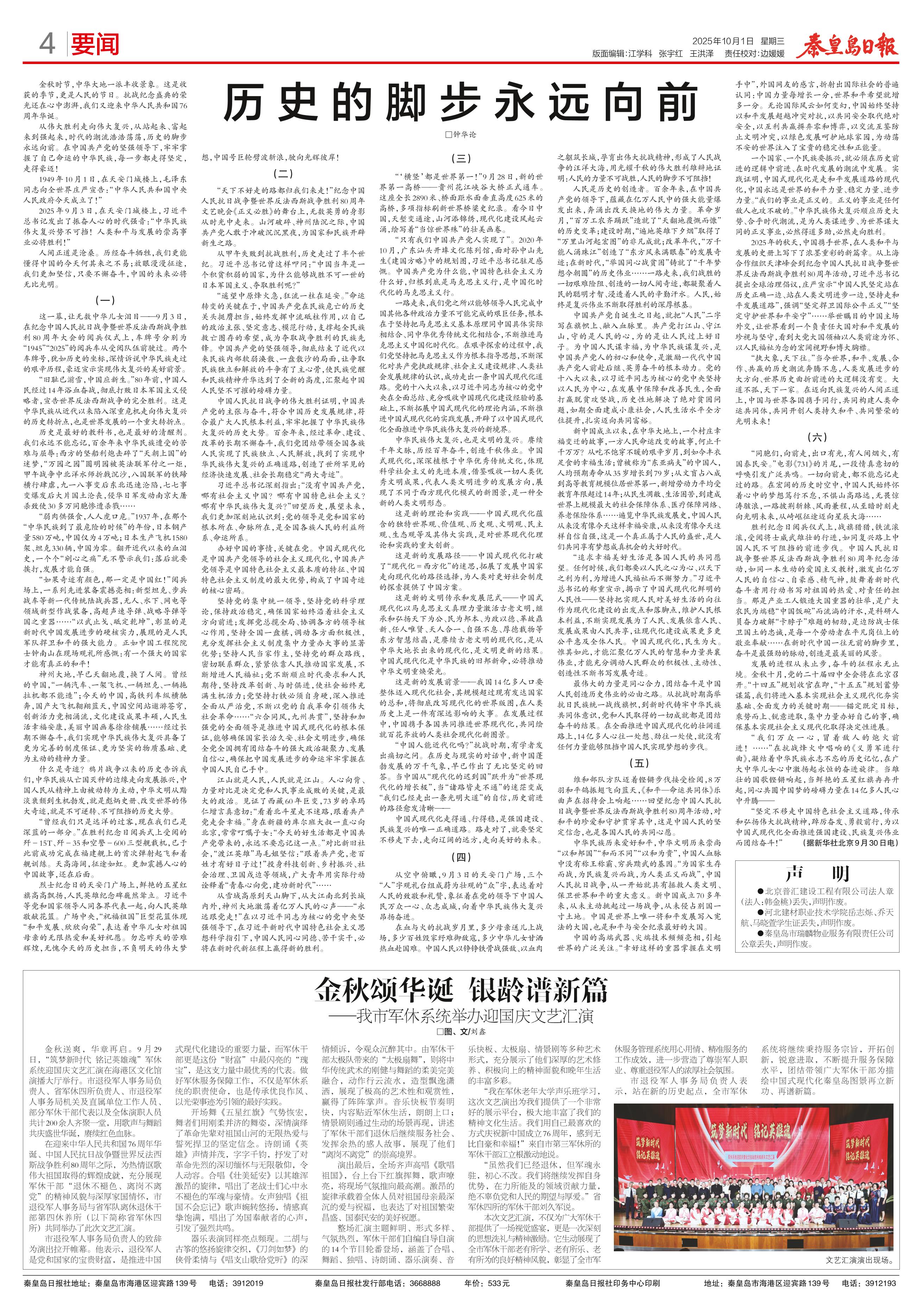 <div style='font-size: 22px!important;line-height: 34px!important;text-align: justify!important;color: #000!important'>历史的脚步永远向前</div><div style='font-size: 14px!important;line-height: 22px!important;text-align: left!important;color: #777!important;margin-top: 20px;'>秦皇岛日报  2025-10-01</div><div><img id='paperImg' style='max-width: 100%;height: auto' src='//img.founderfx.cn/epaper/202510/01/fcfa5398d411470fb8d7f3f89447fef1/4.jpg' alt='' class='page-img'/></div><p>□钟华论</p><p>金秋时节,中华大地一派丰收景象。这是收获的季节,更是人民的节日。抗战纪念盛典的荣光还在心中澎湃,我们又迎来中华人民共和国76周年华诞。</p><p>从伟大胜利走向伟大复兴,从站起来、富起来到强起来,时代的潮流浩浩荡荡,历史的脚步永远向前。在中国共产党的坚强领导下,牢牢掌握了自己命运的中华民族,每一步都走得坚定,走得豪迈!</p><p>1949年10月1日,在天安门城楼上,毛泽东同志向全世界庄严宣告:“中华人民共和国中央人民政府今天成立了!”</p><p>2025年9月3日,在天安门城楼上,习近平总书记发出了振奋人心的时代强音:“中华民族伟大复兴势不可挡!人类和平与发展的崇高事业必将胜利!”</p><p>人间正道是沧桑。历经奋斗牺牲,我们更能懂得中国的今天何其来之不易;放眼漫漫征途,我们更加坚信,只要不懈奋斗,中国的未来必将无比光明。</p><p>(一)</p><p>这一幕,让无数中华儿女泪目——9月3日,在纪念中国人民抗日战争暨世界反法西斯战争胜利80周年大会的阅兵仪式上,车牌号分别为“1945”“2025”的阅兵车从受阅队伍前驶过。两个车牌号,犹如历史的坐标,深情诉说中华民族走过的艰辛历程,豪迈宣示实现伟大复兴的美好前景。</p><p>“旧耻已湔雪,中国应新生。”80年前,中国人民经过14年浴血奋战,彻底打败日本军国主义侵略者,宣告世界反法西斯战争的完全胜利。这是中华民族从近代以来陷入深重危机走向伟大复兴的历史转折点,也是世界发展的一个重大转折点。</p><p>历史是最好的教科书,也是最好的清醒剂。我们永远不能忘记,百余年来中华民族遭受的苦难与屈辱:西方的坚船利炮击碎了“天朝上国”的迷梦,“万园之园”圆明园被英法联军付之一炬,甲午战争中北洋水师折戟沉沙,八国联军的铁蹄横行肆虐,九一八事变后东北迅速沦陷,七七事变爆发后大片国土沦丧,侵华日军发动南京大屠杀致使30多万同胞惨遭杀戮……</p><p>“弱肉供强食,人人虎口危。”1937年,在那个“中华民族到了最危险的时候”的年份,日本钢产量580万吨,中国仅为4万吨;日本生产飞机1580架、坦克330辆,中国为零。翻开近代以来的血泪史,一个个“剜心之痛”无不警示我们:落后就要挨打,发展才能自强。</p><p>“如果奇迹有颜色,那一定是中国红!”阅兵场上,一系列先进装备震撼亮相:新型坦克、步兵战车等新一代传统陆战兵器,无人、水下、网电等领域新型作战装备,高超声速导弹、战略导弹等国之重器……“以武止戈、砥定乾坤”,彰显的是新时代中国发展进步的硬核实力,展现的是人民军队捍卫和平的强大能力。正如中国工程院院士钟南山在现场观礼所感慨:有一个强大的国家才能有真正的和平!</p><p>神州大地,早已天翻地覆,换了人间。曾经的中国,“一辆汽车、一架飞机、一辆坦克、一辆拖拉机都不能造”;今天的中国,高铁列车纵横驰奔,国产大飞机翱翔蓝天,中国空间站遨游苍穹,创新活力竞相涌流,文化建设成果丰硕,人民生活幸福安康,美丽中国画卷徐徐铺展……经过长期不懈奋斗,我们实现中华民族伟大复兴具备了更为完善的制度保证、更为坚实的物质基础、更为主动的精神力量。</p><p>什么是奇迹?鸦片战争以来的历史告诉我们,中华民族从亡国灭种的边缘走向发展振兴,中国人民从精神上由被动转为主动,中华文明从黯淡衰颓到生机勃发,就是彪炳史册、改变世界的伟大奇迹,就是不可逆转、不可阻挡的历史大势。</p><p>“曾经我们只是远洋的过客,现在我们已是深蓝的一部分。”在胜利纪念日阅兵式上受阅的歼-15T、歼-35和空警-600三型舰载机,已于此前成功完成在福建舰上的首次弹射起飞和着舰训练。天高海阔,征途如虹。更加震撼人心的中国故事,还在后面。</p><p>烈士纪念日的天安门广场上,鲜艳的五星红旗高高飘扬,人民英雄纪念碑巍然耸立。习近平等党和国家领导人同各界代表一起,向人民英雄敬献花篮。广场中央,“祝福祖国”巨型花篮体现“和平发展、欣欣向荣”,表达着中华儿女对祖国母亲的无限热爱和美好祝愿。勿忘昨天的苦难辉煌,无愧今天的历史担当,不负明天的伟大梦想,中国号巨轮劈波斩浪,驶向光辉彼岸!</p><p>(二)</p><p>“天下不好走的路都归我们来走!”纪念中国人民抗日战争暨世界反法西斯战争胜利80周年文艺晚会《正义必胜》的舞台上,无数英勇的身影从时光中走来。山河破碎、神州陆沉之际,中国共产党人敢于冲破沉沉黑夜,为国家和民族开辟新生之路。</p><p>从甲午失败到抗战胜利,历史走过了半个世纪。习近平总书记曾这样叩问:“中国当年是一个积贫积弱的国家,为什么能够战胜不可一世的日本军国主义、夺取胜利呢?”</p><p>“遥望中原烽火急,狂流一柱在延安。”命运转变的关键在于,中国共产党在民族危亡的历史关头挺膺担当,始终发挥中流砥柱作用,以自己的政治主张、坚定意志、模范行动,支撑起全民族救亡图存的希望,成为夺取战争胜利