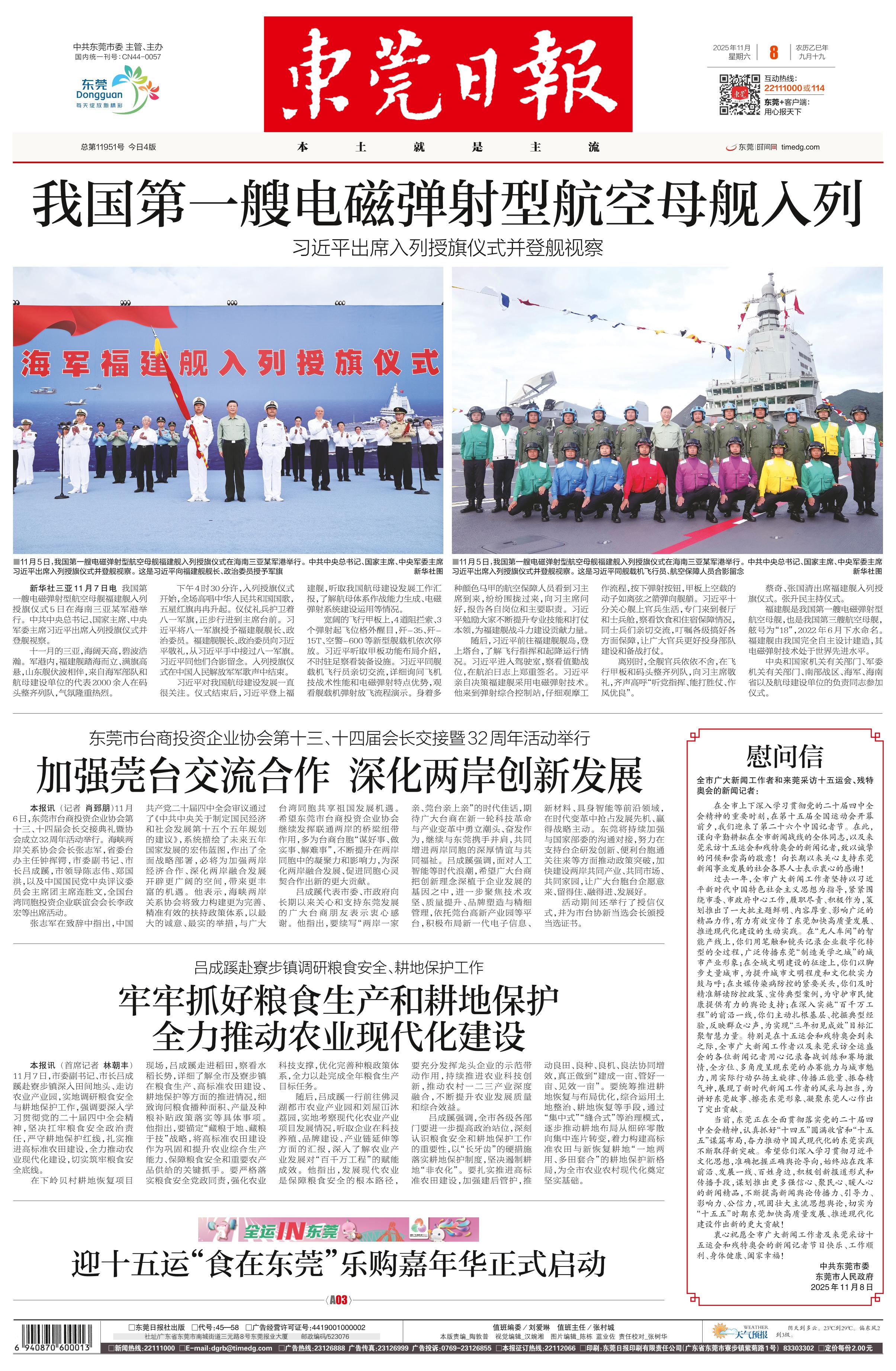 <div style='font-size: 22px!important;line-height: 34px!important;text-align: justify!important;color: #000!important'>我国第一艘电磁弹射型航空母舰入列</div><div style='font-size: 16px!important;line-height: 28px!important;text-align: justify;color: #777!important;margin-top: 20px;'>习近平出席入列授旗仪式并登舰视察</div><div style='font-size: 14px!important;line-height: 22px!important;text-align: left!important;color: #777!important;margin-top: 20px;'>东莞日报  新华社三亚11月7日电  2025-11-08</div><div><img id='paperImg' style='max-width: 100%;height: auto' src='//img.founderfx.cn/epaper/202511/08/d40f209d950d4120a0db3dc353bd0cb3/1.jpg' alt='' class='page-img'/></div><div style='font-size: 14px!important;line-height: 22px!important;text-align: center!important;color: #777!important;'><img src='//img.founderfx.cn/epaper/202511/08/d40f209d950d4120a0db3dc353bd0cb3/A01/20556162_sm1_1762520326817_s.jpg'style='display: block!important;margin: auto!important;max-width: 100%!important;'/> ■11月5日,我国第一艘电磁弹射型航空母舰福建舰入列授旗仪式在海南三亚某军港举行。中共中央总书记、国家主席、中央军委主席习近平出席入列授旗仪式并登舰视察。这是习近平向福建舰舰长、政治委员授予军旗 新华社图<img src='//img.founderfx.cn/epaper/202511/08/d40f209d950d4120a0db3dc353bd0cb3/A01/20556163_sm1_1762520269202_s.jpg'style='display: block!important;margin: auto!important;max-width: 100%!important;'/> ■11月5日,我国第一艘电磁弹射型航空母舰福建舰入列授旗仪式在海南三亚某军港举行。中共中央总书记、国家主席、中央军委主席习近平出席入列授旗仪式并登舰视察。这是习近平同舰载机飞行员、航空保障人员合影留念 新华社图</div><p> 我国第一艘电磁弹射型航空母舰福建舰入列授旗仪式5日在海南三亚某军港举行。中共中央总书记、国家主席、中央军委主席习近平出席入列授旗仪式并登舰视察。</p><p> 十一月的三亚,海阔天高,碧波浩瀚。军港内,福建舰踏海而立、满旗高悬,山东舰伏波相伴,来自海军部队和航母建设单位的代表2000余人在码头整齐列队,气氛隆重热烈。</p><p> 下午4时30分许,入列授旗仪式开始,全场高唱中华人民共和国国歌,五星红旗冉冉升起。仪仗礼兵护卫着八一军旗,正步行进到主席台前。习近平将八一军旗授予福建舰舰长、政治委员。福建舰舰长、政治委员向习近平敬礼,从习近平手中接过八一军旗。习近平同他们合影留念。入列授旗仪式在中国人民解放军军歌声中结束。</p><p> 习近平对我国航母建设发展一直很关注。仪式结束后,习近平登上福建舰,听取我国航母建设发展工作汇报,了解航母体系作战能力生成、电磁弹射系统建设运用等情况。</p><p> 宽阔的飞行甲板上,4道阻拦索、3个弹射起飞位格外醒目,歼-35、歼-15T、空警-600等新型舰载机依次停放。习近平听取甲板功能布局介绍,不时驻足察看装备设施。习近平同舰载机飞行员亲切交流,详细询问飞机技战术性能和电磁弹射特点优势,观看舰载机弹射放飞流程演示。身着多种颜色马甲的航空保障人员看到习主席到来,纷纷围拢过来,向习主席问好,报告各自岗位和主要职责。习近平勉励大家不断提升专业技能和打仗本领,为福建舰战斗力建设贡献力量。</p><p> 随后,习近平前往福建舰舰岛,登上塔台,了解飞行指挥和起降运行情况。习近平进入驾驶室,察看值勤战位,在航泊日志上郑重签名。习近平亲自决策福建舰采用电磁弹射技术。他来到弹射综合控制站,仔细观摩工作流程,按下弹射按钮,甲板上空载的动子如离弦之箭弹向舰艏。习近平十分关心舰上官兵生活,专门来到餐厅和士兵舱,察看饮食和住宿保障情况,同士兵们亲切交流,叮嘱各级搞好各方面保障,让广大官兵更好投身部队建设和备战打仗。</p><p> 离别时,全舰官兵依依不舍,在飞行甲板和码头整齐列队,向习主席敬礼,齐声高呼“听党指挥、能打胜仗、作风优良”。</p><p> 蔡奇、张国清出席福建舰入列授旗仪式。张升民主持仪式。</p><p> 福建舰是我国第一艘电磁弹射型航空母舰,也是我国第三艘航空母舰,舷号为“18”,2022年6月下水命名。福建舰由我国完全自主设计建造,其电磁弹射技术处于世界先进水平。</p><p> 中央和国家机关有关部门、军委机关有关部门、南部战区、海军、海南省以及航母建设单位的负责同志参加仪式。</p>