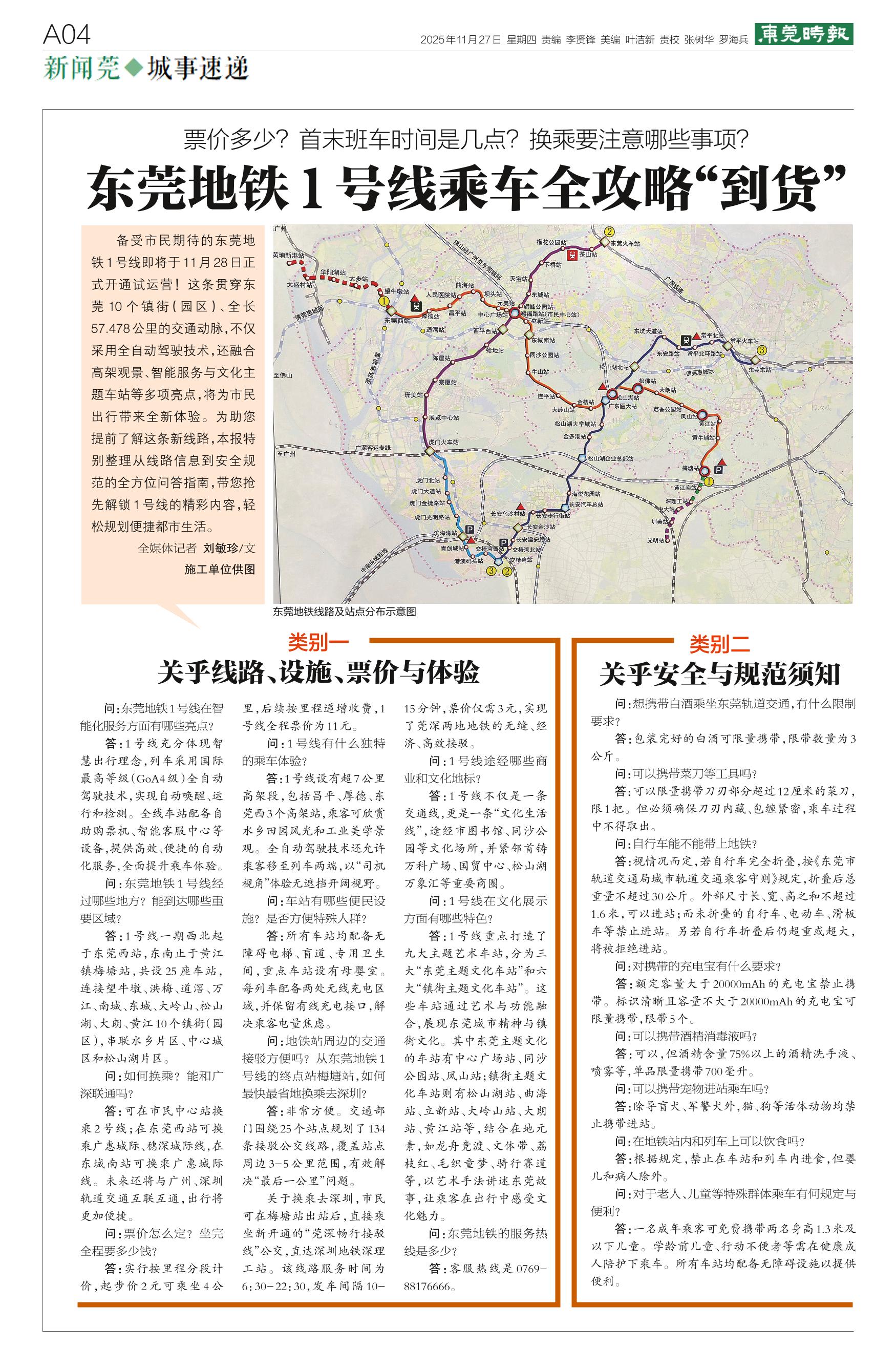 <div style='font-size: 16px!important;line-height: 28px!important;text-align: justify;color: #777!important;'>票价多少?首末班车时间是几点?换乘要注意哪些事项?</div><div style='font-size: 22px!important;line-height: 34px!important;text-align: justify!important;color: #000!important'>东莞地铁1号线乘车全攻略“到货”</div><div style='font-size: 14px!important;line-height: 22px!important;text-align: left!important;color: #777!important;margin-top: 20px;'>东莞时报  全媒体记者 刘敏珍/文 施工单位供图  2025-11-27</div><div><img id='paperImg' style='max-width: 100%;height: auto' src='//img.founderfx.cn/epaper/202511/30/f0acdd8e2c8448048ee5c32f2099dad5/3.jpg' alt='' class='page-img'/></div><div style='font-size: 14px!important;line-height: 22px!important;text-align: center!important;color: #777!important;'><img src='//img.founderfx.cn/epaper/202511/30/f0acdd8e2c8448048ee5c32f2099dad5/A04/20802585_sm1_1764162631881_s.jpg'style='display: block!important;margin: auto!important;max-width: 100%!important;'/> 东莞地铁线路及站点分布示意图</div><p> 备受市民期待的东莞地铁1号线即将于11月28日正式开通试运营!这条贯穿东莞10个镇街(园区)、全长57.478公里的交通动脉,不仅采用全自动驾驶技术,还融合高架观景、智能服务与文化主题车站等多项亮点,将为市民出行带来全新体验。为助您提前了解这条新线路,本报特别整理从线路信息到安全规范的全方位问答指南,带您抢先解锁1号线的精彩内容,轻松规划便捷都市生活。</p><p> </p><p> </p><p> 类别一</p><p> 关乎线路、设施、票价与体验</p><p> 问:东莞地铁1号线在智能化服务方面有哪些亮点?</p><p> 答:1号线充分体现智慧出行理念,列车采用国际最高等级(GoA4级)全自动驾驶技术,实现自动唤醒、运行和检测。全线车站配备自助购票机、智能客服中心等设备,提供高效、便捷的自动化服务,全面提升乘车体验。</p><p> 问:东莞地铁1号线经过哪些地方?能到达哪些重要区域?</p><p> 答:1号线一期西北起于东莞西站,东南止于黄江镇梅塘站,共设25座车站,连接望牛墩、洪梅、道滘、万江、南城、东城、大岭山、松山湖、大朗、黄江10个镇街(园区),串联水乡片区、中心城区和松山湖片区。</p><p> 问:如何换乘?能和广深联通吗?</p><p> 答:可在市民中心站换乘2号线;在东莞西站可换乘广惠城际、穗深城际线,在东城南站可换乘广惠城际线。未来还将与广州、深圳轨道交通互联互通,出行将更加便捷。</p><p> 问:票价怎么定?坐完全程要多少钱?</p><p> 答:实行按里程分段计价,起步价2元可乘坐4公里,后续按里程递增收费,1号线全程票价为11元。</p><p> 问:1号线有什么独特的乘车体验?</p><p> 答:1号线设有超7公里高架段,包括昌平、厚德、东莞西3个高架站,乘客可欣赏水乡田园风光和工业美学景观。全自动驾驶技术还允许乘客移至列车两端,以“司机视角”体验无遮挡开阔视野。</p><p> 问:车站有哪些便民设施?是否方便特殊人群?</p><p> 答:所有车站均配备无障碍电梯、盲道、专用卫生间,重点车站设有母婴室。每列车配备两处无线充电区域,并保留有线充电接口,解决乘客电量焦虑。</p><p> 问:地铁站周边的交通接驳方便吗?从东莞地铁1号线的终点站梅塘站,如何最快最省地换乘去深圳?</p><p> 答:非常方便。交通部门围绕25个站点规划了134条接驳公交线路,覆盖站点周边3-5公里范围,有效解决“最后一公里”问题。</p><p> 关于换乘去深圳,市民可在梅塘站出站后,直接乘坐新开通的“莞深畅行接驳线”公交,直达深圳地铁深理工站。该线路服务时间为6:30-22:30,发车间隔10-15分钟,票价仅需3元,实现了莞深两地地铁的无缝、经济、高效接驳。</p><p> 问:1号线途经哪些商业和文化地标?</p><p> 答:1号线不仅是一条交通线,更是一条“文化生活线”,途经市图书馆、同沙公园等文化场所,并紧邻首铸万科广场、国贸中心、松山湖万象汇等重要商圈。</p><p> 问:1号线在文化展示方面有哪些特色?</p><p> 答:1号线重点打造了九大主题艺术车站,分为三大“东莞主题文化车站”和六大“镇街主题文化车站”。这些车站通过艺术与功能融合,展现东莞城市精神与镇街文化。其中东莞主题文化的车站有中心广场站、同沙公园站、凤山站;镇街主题文化车站则有松山湖站、曲海站、立新站、大岭山站、大朗站、黄江站等,结合在地元素,如龙舟竞渡、文体带、荔枝红、毛织童梦、骑行赛道等,以艺术手法讲述东莞故事,让乘客在出行中感受文化魅力。</p><p> 问:东莞地铁的服务热线是多少?</p><p> 答:客服热线是0769-88176666。</p><p> </p><p> 类别二</p><p> 关乎安全与规范须知</p><p> 问:想携带白酒乘坐东莞轨道交通,有什么限制要求?</p><p> 答:包装完好的白酒可限量携带,限带数量为3公斤。</p><p> 问:可以携带菜刀等工具吗?</p><p> 答:可以限量携带刀刃部分超过12厘米的菜刀,限1把。但必须确保刀刃内藏、包缠紧密,乘车过程中不得取出。</p><p> 问:自行车能不能带上地铁?</p><p> 答:视情况而定,若自行车完全折叠,按《东莞市轨道交通局城市轨道交通乘客守则》规定,折叠后总重量不超过30公斤。外部尺寸长、宽、高之和不超过1.6米,可以进站;而未折叠的自行车、电动车、滑板车等禁止进站。另若自行车折叠后仍超重或超大,将被拒绝进站。</p><p> 问:对携带的充电宝有什么要求?</p><p> 答:额定容量大于20000mAh的充电宝禁止携带。标识清晰且容量不大于20000mAh的充电宝可限量携带,限带5个。</p><p> 问:可