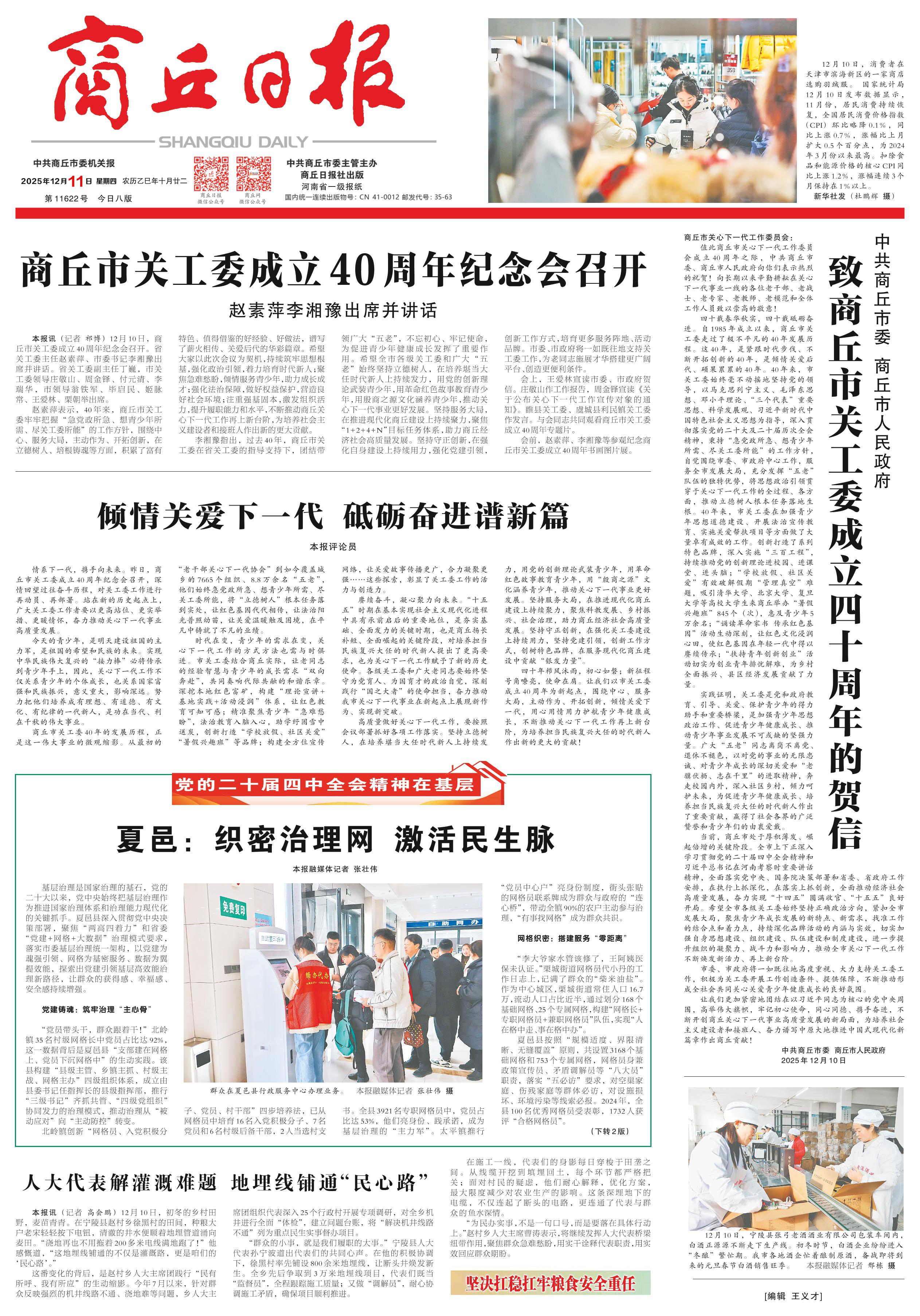 <div style='font-size: 22px!important;line-height: 34px!important;text-align: justify!important;color: #000!important'>商丘市关工委成立40周年纪念会召开</div><div style='font-size: 16px!important;line-height: 28px!important;text-align: justify;color: #777!important;margin-top: 20px;'>赵素萍李湘豫出席并讲话</div><div style='font-size: 14px!important;line-height: 22px!important;text-align: left!important;color: #777!important;margin-top: 20px;'>商丘日报云阅读  记者 祁博  2025-12-11</div><div><img id='paperImg' style='max-width: 100%;height: auto' src='//img.founderfx.cn/epaper/202512/11/e38f674fb19243f59e3ca26d90dac779/1.jpg' alt='' class='page-img'/></div><p> 12月10日,商丘市关工委成立40周年纪念会召开。省关工委主任赵素萍、市委书记李湘豫出席并讲话。省关工委副主任丁巍,市关工委领导庄敬山、周金铎、付元清、李瑞华,市领导翁铁军、毕启民、姬脉常、王爱林、栗朝举出席。</p><p> 赵素萍表示,40年来,商丘市关工委牢牢把握“急党政所急、想青少年所需、尽关工委所能”的工作方针,围绕中心、服务大局,主动作为、开拓创新,在立德树人、培根铸魂等方面,积累了富有特色、值得借鉴的好经验、好做法,谱写了薪火相传、关爱后代的华彩篇章。希望大家以此次会议为契机,持续筑牢思想根基,强化政治引领,着力培育时代新人;聚焦急难愁盼,倾情服务青少年,助力成长成才;强化法治保障,做好权益保护,营造良好社会环境;注重强基固本,激发组织活力,提升履职能力和水平,不断推动商丘关心下一代工作再上新台阶,为培养社会主义建设者和接班人作出新的更大贡献。</p><p> 李湘豫指出,过去40年,商丘市关工委在省关工委的指导支持下,团结带领广大“五老”,不忘初心、牢记使命,为促进青少年健康成长发挥了重要作用。希望全市各级关工委和广大“五老”始终坚持立德树人,在培养堪当大任时代新人上持续发力,用党的创新理论武装青少年,用革命红色故事教育青少年,用殷商之源文化涵养青少年,推动关心下一代事业更好发展。坚持服务大局,在推进现代化商丘建设上持续聚力,聚焦“1+2+4+N”目标任务体系,助力商丘经济社会高质量发展。坚持守正创新,在强化自身建设上持续用力,强化党建引领,创新工作方式,培育更多服务阵地、活动品牌。市委、市政府将一如既往地支持关工委工作,为老同志施展才华搭建更广阔平台、创造更便利条件。</p><p> 会上,王爱林宣读市委、市政府贺信。庄敬山作工作报告,周金铎宣读《关于公布关心下一代工作宣传对象的通知》。睢县关工委、虞城县利民镇关工委作发言。与会同志共同观看商丘市关工委成立40周年专题片。</p><p> 会前,赵素萍、李湘豫等参观纪念商丘市关工委成立40周年书画图片展。</p>
