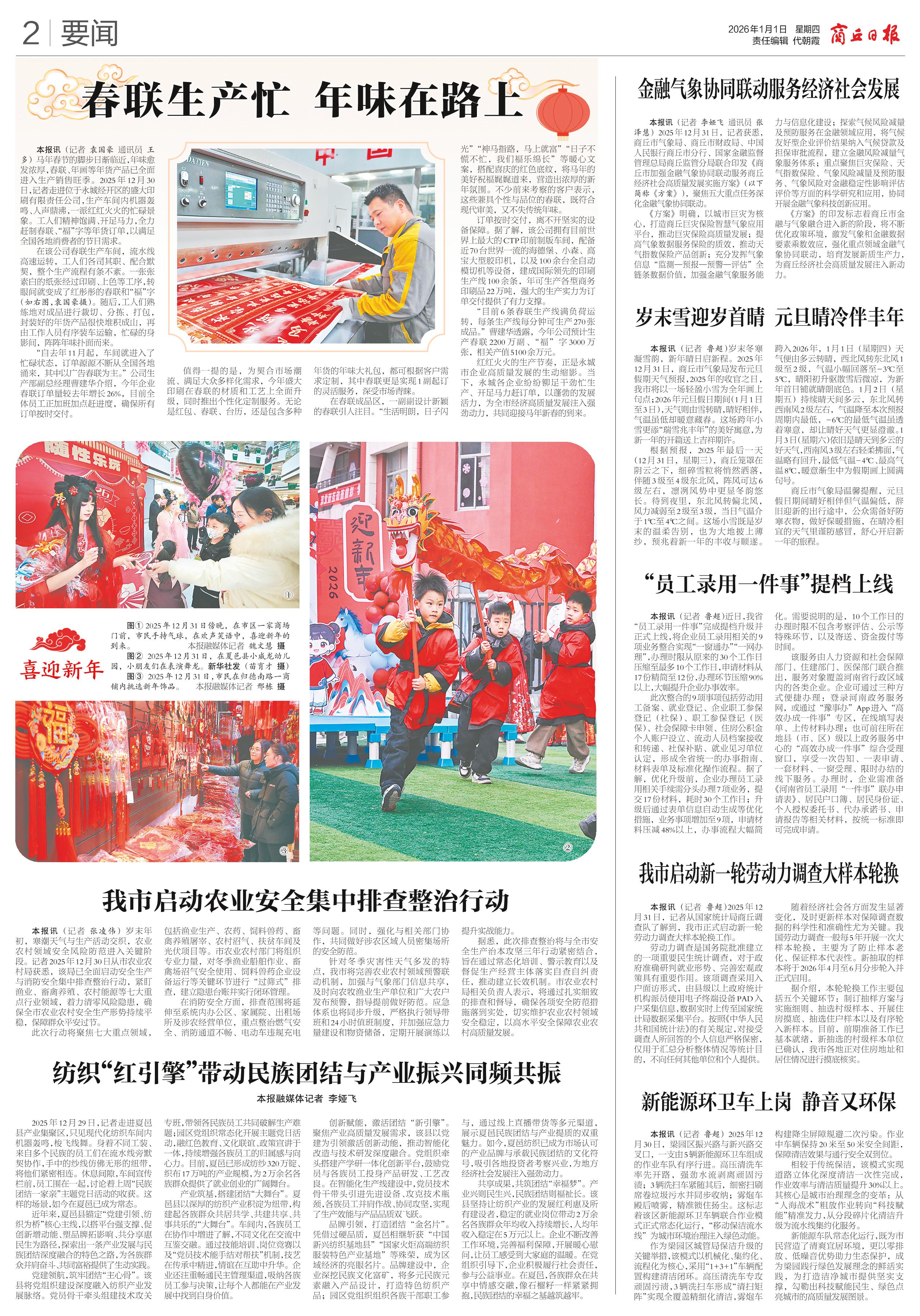 <div style='font-size: 22px!important;line-height: 34px!important;text-align: justify!important;color: #000!important'>春联生产忙 年味在路上</div><div style='font-size: 14px!important;line-height: 22px!important;text-align: left!important;color: #777!important;margin-top: 20px;'>商丘日报云阅读  记者 袁国豪 通讯员 王多  2026-01-01</div><div><img id='paperImg' style='max-width: 100%;height: auto' src='//img.founderfx.cn/epaper/202601/01/86f0e7ddf9fb4a42a54cb1c79bfb9855/2.jpg' alt='' class='page-img'/></div><div style='font-size: 14px!important;line-height: 22px!important;text-align: center!important;color: #777!important;'><img src='//img.founderfx.cn/epaper/202601/01/86f0e7ddf9fb4a42a54cb1c79bfb9855/02/3262121_gm_1767168197919_s.jpg'style='display: block!important;margin: auto!important;max-width: 100%!important;'/></div><p> 马年春节的脚步日渐临近,年味愈发浓厚,春联、年画等年货产品已全面进入生产销售旺季。2025年12月30日,记者走进位于永城经开区的盛大印刷有限责任公司,生产车间内机器轰鸣、人声鼎沸,一派红红火火的忙碌景象。工人们精神饱满、开足马力,全力赶制春联、“福”字等年货订单,以满足全国各地消费者的节日需求。</p><p> 在该公司春联生产车间,流水线高速运转,工人们各司其职、配合默契,整个生产流程有条不紊。一张张素白的纸张经过印刷、上色等工序,转眼间就变成了红彤彤的春联和“福”字(如右图,袁国豪摄)。随后,工人们熟练地对成品进行裁切、分拣、打包,封装好的年货产品很快堆积成山,再由工作人员有序装车运输,忙碌的身影间,阵阵年味扑面而来。</p><p> “自去年11月起,车间就进入了忙碌状态,订单源源不断从全国各地涌来,其中以广告春联为主。”公司生产部副总经理曹建华介绍,今年企业春联订单量较去年增长26%,目前全体员工正加班加点赶进度,确保所有订单按时交付。</p><p> 值得一提的是,为契合市场潮流、满足大众多样化需求,今年盛大印刷在春联的材质和工艺上全面升级,同时推出个性化定制服务。无论是红包、春联、台历,还是包含多种年货的年味大礼包,都可根据客户需求定制,其中春联更是实现1副起订的灵活服务,深受市场青睐。</p><p> 在春联成品区,一副副设计新颖的春联引人注目。“生活明朗,日子闪光”“神马指路,马上就富”“日子不慌不忙,我们福乐绵长”等暖心文案,搭配喜庆的红色底纹,将马年的美好祝福娓娓道来,营造出浓厚的新年氛围。不少前来考察的客户表示,这些兼具个性与品位的春联,既符合现代审美,又不失传统年味。</p><p> 订单按时交付,离不开坚实的设备保障。据了解,该公司拥有目前世界上最大的CTP印前制版车间,配备近70台世界一流的海德堡、小森、高宝大型胶印机,以及100余台全自动模切机等设备,建成国际领先的印刷生产线100余条,年可生产各型商务印刷品22万吨,强大的生产实力为订单交付提供了有力支撑。</p><p> “目前6条春联生产线满负荷运转,每条生产线每分钟可生产270张成品。”曹建华透露,今年公司预计生产春联2200万副、“福”字3000万张,相关产值5100余万元。</p><p> 红红火火的生产节奏,正是永城市企业高质量发展的生动缩影。当下,永城各企业纷纷铆足干劲忙生产、开足马力赶订单,以蓬勃的发展活力,为全市经济高质量发展注入强劲动力,共同迎接马年新春的到来。</p>