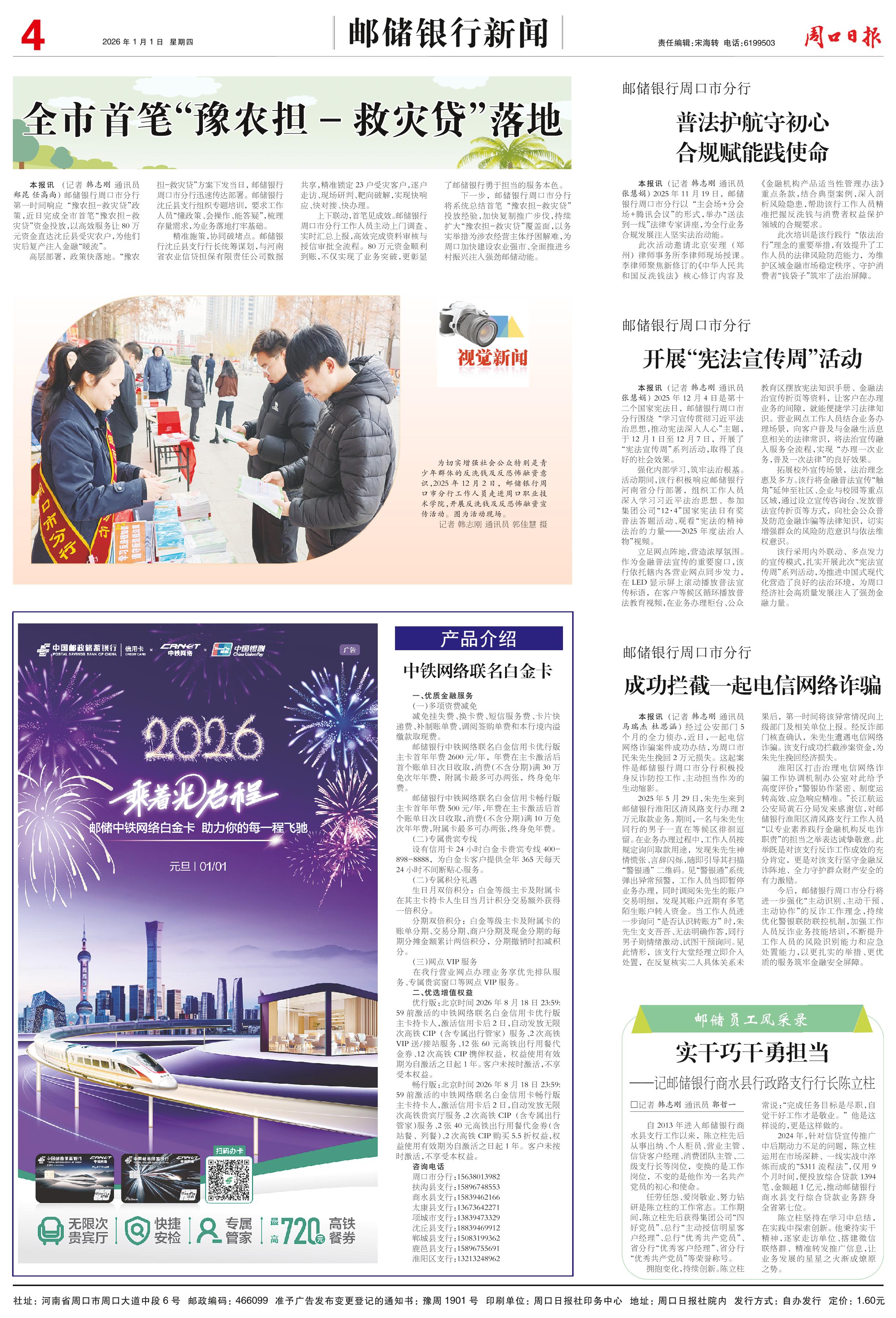 <div style='font-size: 16px!important;line-height: 28px!important;text-align: justify;color: #777!important;'>邮储银行周口市分行</div><div style='font-size: 22px!important;line-height: 34px!important;text-align: justify!important;color: #000!important'>成功拦截一起电信网络诈骗</div><div style='font-size: 14px!important;line-height: 22px!important;text-align: left!important;color: #777!important;margin-top: 20px;'>周口日报  2026-01-01</div><div><img id='paperImg' style='max-width: 100%;height: auto' src='//img.founderfx.cn/epaper/202601/01/14e9719b21f746bf92b68da79bb2f430/4.jpg' alt='' class='page-img'/></div><p> 本报讯(记者 韩志刚 通讯员 马瑞杰 杜思涵) 经过公安部门5个月的全力侦办,近日,一起电信网络诈骗案件成功办结,为周口市民朱先生挽回2万元损失。这起案件是邮储银行周口市分行积极投身反诈防控工作、主动担当作为的生动缩影。</p><p> 2025年5月29日,朱先生来到邮储银行淮阳区清风路支行办理2万元取款业务。期间,一名与朱先生同行的男子一直在等候区徘徊逗留。在业务办理过程中,工作人员按规定询问取款用途,发现朱先生神情慌张、言辞闪烁,随即引导其扫描 “警银通” 二维码。见“警银通”系统弹出异常预警,工作人员当即暂停业务办理,同时调阅朱先生的账户交易明细,发现其账户近期有多笔陌生账户转入资金。当工作人员进一步询问 “是否认识转账方” 时,朱先生支支吾吾、无法明确作答,同行男子则情绪激动、试图干预询问。见此情形,该支行大堂经理立即介入处置,在反复核实二人具体关系未果后,第一时间将该异常情况向上级部门及相关单位上报。经反诈部门核查确认,朱先生遭遇电信网络诈骗。该支行成功拦截涉案资金,为朱先生挽回经济损失。</p><p> 淮阳区打击治理电信网络诈骗工作协调机制办公室对此给予高度评价:“警银协作紧密、制度运转高效、应急响应精准。”长江航运公安局黄石分局发来感谢信,对邮储银行淮阳区清风路支行工作人员“以专业素养践行金融机构反电诈职责”的担当之举表达诚挚敬意。此举既是对该支行反诈工作成效的充分肯定,更是对该支行坚守金融反诈阵地、全力守护群众财产安全的有力激励。</p><p> 今后,邮储银行周口市分行将进一步强化“主动识别、主动干预、主动协作”的反诈工作理念,持续优化警银联防联控机制,加强工作人员反诈业务技能培训,不断提升工作人员的风险识别能力和应急处置能力,以更扎实的举措、更优质的服务筑牢金融安全屏障。</p>