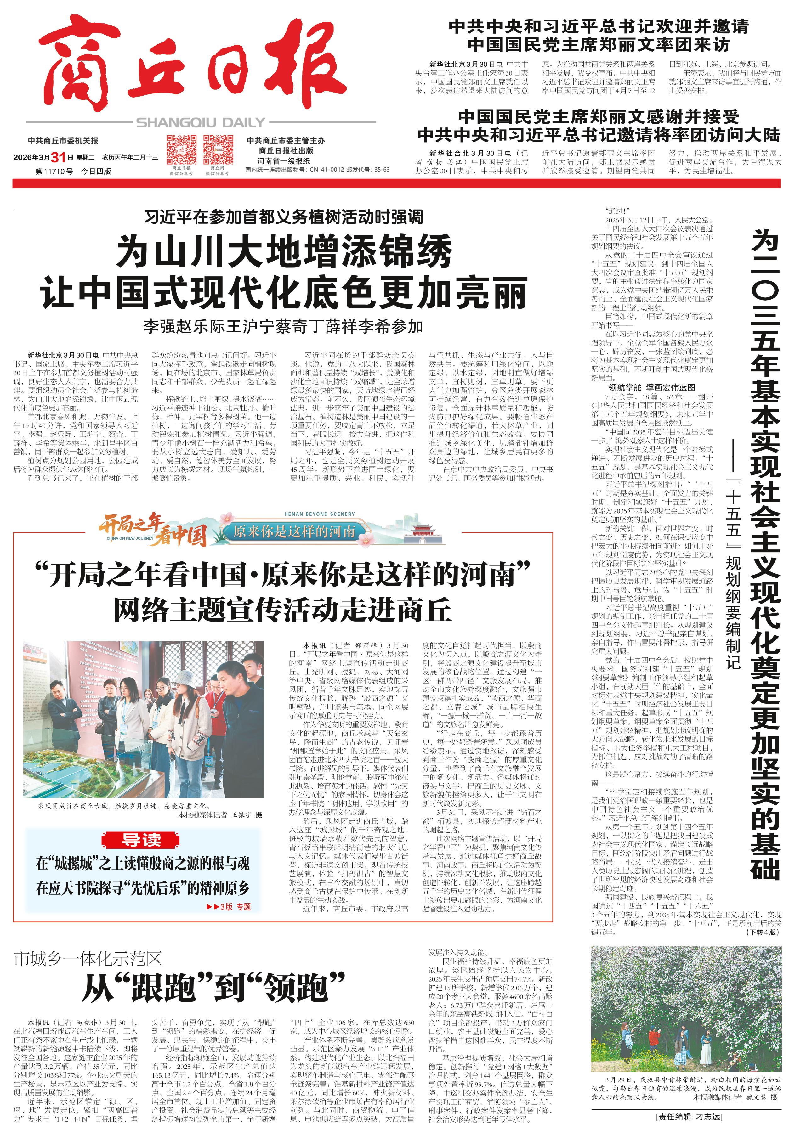 <div style='font-size: 16px!important;line-height: 28px!important;text-align: justify;color: #777!important;'>习近平在参加首都义务植树活动时强调</div><div style='font-size: 22px!important;line-height: 34px!important;text-align: justify!important;color: #000!important'>为山川大地增添锦绣 让中国式现代化底色更加亮丽</div><div style='font-size: 16px!important;line-height: 28px!important;text-align: justify;color: #777!important;margin-top: 20px;'>李强赵乐际王沪宁蔡奇丁薛祥李希参加</div><div style='font-size: 14px!important;line-height: 22px!important;text-align: left!important;color: #777!important;margin-top: 20px;'>商丘日报云阅读  2026-03-31</div><div><img id='paperImg' style='max-width: 100%;height: auto' src='//img.founderfx.cn/epaper/202603/31/ece0c05a4a68429aa77e6780fc1b4bf8/1.jpg' alt='' class='page-img'/></div><p> 新华社北京3月30日电 中共中央总书记、国家主席、中央军委主席习近平30日上午在参加首都义务植树活动时强调,良好生态人人共享,也需要合力共建。要组织动员全社会广泛参与植树造林,为山川大地增添锦绣,让中国式现代化的底色更加亮丽。</p><p> 首都北京春风和煦、万物生发。上午10时40分许,党和国家领导人习近平、李强、赵乐际、王沪宁、蔡奇、丁薛祥、李希等集体乘车,来到昌平区百善镇,同干部群众一起参加义务植树。</p><p> 植树点为规划公园用地,公园建成后将为群众提供生态休闲空间。</p><p> 看到总书记来了,正在植树的干部群众纷纷热情地向总书记问好。习近平向大家挥手致意,拿起铁锹走向植树现场,同在场的北京市、国家林草局负责同志和干部群众、少先队员一起忙碌起来。</p><p> 挥锹铲土、培土围堰、提水浇灌……习近平接连种下油松、北京牡丹、榆叶梅、杜仲、元宝枫等多棵树苗。他一边植树,一边询问孩子们的学习生活、劳动锻炼和参加植树情况。习近平强调,青少年像小树苗一样充满活力和希望,要从小树立远大志向,爱知识、爱劳动、爱自然,德智体美劳全面发展,努力成长为栋梁之材。现场气氛热烈,一派繁忙景象。</p><p> 习近平同在场的干部群众亲切交谈。他说,党的十八大以来,我国森林面积和蓄积量持续“双增长”,荒漠化和沙化土地面积持续“双缩减”,是全球增绿最多最快的国家,天蓝地绿水清已经成为常态。前不久,我国颁布生态环境法典,进一步筑牢了美丽中国建设的法治基石。植树造林是美丽中国建设的一项重要任务,要咬定青山不放松,立足当下、着眼长远、接力奋进,把这件利国利民的大事扎实做好。</p><p> 习近平强调,今年是“十五五”开局之年,也是全民义务植树运动开展45周年。新形势下推进国土绿化,要更加注重提质、兴业、利民,实现种与管共抓、生态与产业共促、人与自然共生。要统筹利用绿化空间,以地定绿、以水定绿,因地制宜做好增绿文章,宜树则树,宜草则草。要下更大气力加强管护,分区分类开展森林可持续经营,有力有效推进草原保护修复,全面提升林草质量和功能,防火防虫护好绿化成果。要畅通生态产品价值转化渠道,壮大林草产业,同步提升经济价值和生态效益。要协同推进城乡绿化美化,见缝插针增加群众身边的绿地,让城乡居民有更多的绿色获得感。</p><p> 在京中共中央政治局委员、中央书记处书记、国务委员等参加植树活动。</p>