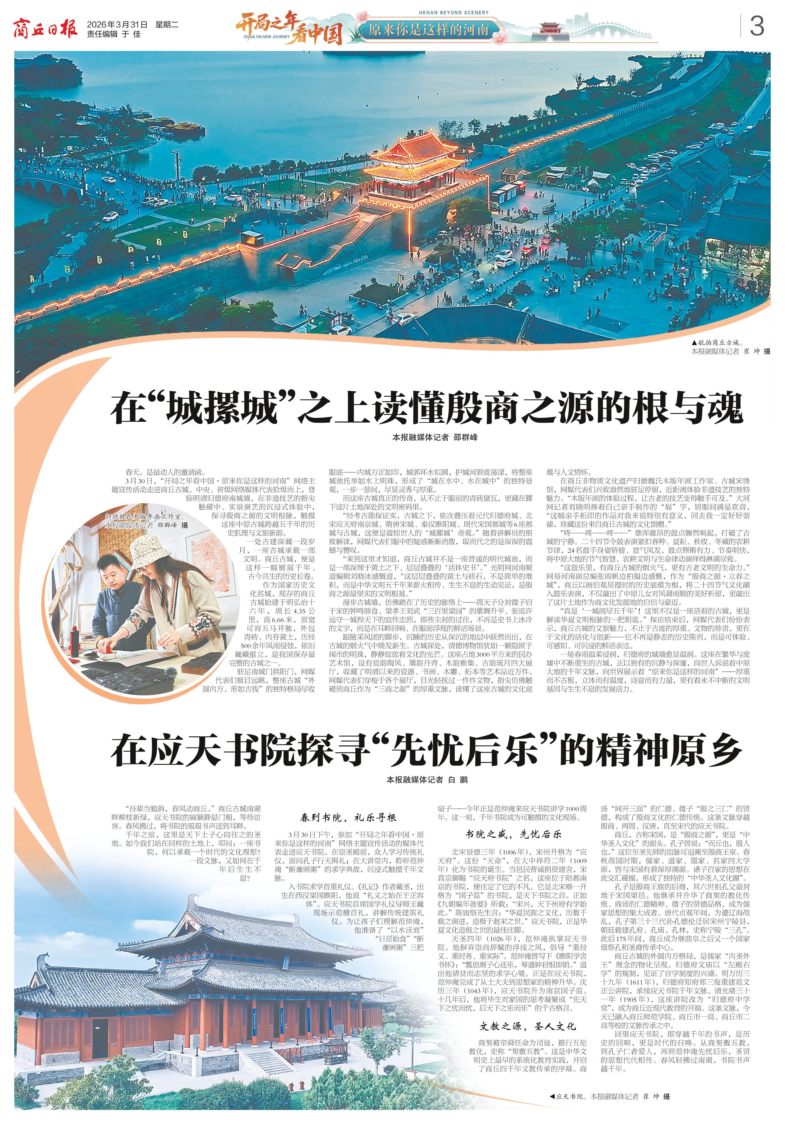 <div style='font-size: 22px!important;line-height: 34px!important;text-align: justify!important;color: #000!important'>在“城摞城”之上读懂殷商之源的根与魂</div><div style='font-size: 14px!important;line-height: 22px!important;text-align: left!important;color: #777!important;margin-top: 20px;'>商丘日报云阅读  本报融媒体记者 邵群峰  2026-03-31</div><div><img id='paperImg' style='max-width: 100%;height: auto' src='//img.founderfx.cn/epaper/202603/31/ece0c05a4a68429aa77e6780fc1b4bf8/3.jpg' alt='' class='page-img'/></div><div style='font-size: 14px!important;line-height: 22px!important;text-align: center!important;color: #777!important;'><img src='//img.founderfx.cn/epaper/202603/31/ece0c05a4a68429aa77e6780fc1b4bf8/03/3545136_gm_1774876625369_s.jpg'style='display: block!important;margin: auto!important;max-width: 100%!important;'/> 归德魏氏木版年画工作室。本报融媒体记者 邵群峰 摄</div><p> 春天,是最动人的邀请函。</p><p> 3月30日,“开局之年看中国·原来你是这样的河南”网络主题宣传活动走进商丘古城。中央、省级网络媒体代表拾级而上,登临明清归德府南城墙,在非遗技艺的指尖触碰中、实景演艺的沉浸式体验中,探寻殷商之源的文明根脉,触摸这座中原古城跨越五千年的历史肌理与文旅新韵。</p><p> 一处古建深藏一段岁月,一座古城承载一部文明。商丘古城,便是这样一幅铺展千年、古今共生的历史长卷。</p><p> 作为国家历史文化名城,现存的商丘古城始建于明弘治十六年,周长4.35公里,高6.66米,顶宽可容五马并驰,外包青砖、内夯黄土,历经500余年风雨侵蚀,依旧巍峨挺立,是我国保存最完整的古城之一。</p><p> 驻足南城门拱阳门,网媒代表们极目远眺,整座古城“外圆内方、形如古钱”的独特格局尽收眼底——内城方正如印,城郭环水似圆,护城河碧波荡漾,将整座城池托举如水上明珠,形成了“城在水中、水在城中”的独特景观,一步一景间,尽显灵秀与厚重。</p><p> 而这座古城真正的传奇,从不止于眼前的青砖黛瓦,更藏在脚下这片土地深处的文明密码里。</p><p> “经考古勘探证实,古城之下,依次叠压着元代归德府城、北宋应天府南京城、隋唐宋城、秦汉睢阳城、周代宋国都城等6座都城与古城,这便是震惊世人的‘城摞城’奇观。”随着讲解员的细致解读,网媒代表们眼中的疑惑渐渐消散,取而代之的是深深的震撼与赞叹。</p><p> “来到这里才知道,商丘古城并不是一座普通的明代城池,而是一部深埋于黄土之下、层层叠叠的‘活体史书’。”光明网河南频道编辑刘晓冰感慨道,“这层层叠叠的黄土与砖石,不是简单的堆积,而是中华文明五千年来薪火相传、生生不息的生动见证,是殷商之源最坚实的文明根基。”</p><p> 漫步古城墙,仿佛踏在了历史的脉络上——周天子分封微子启于宋的钟鸣鼎食、梁孝王刘武“三百里梁园”的歌舞升平、张巡许远守一城捍天下的血性忠烈,那些尘封的过往,不再是史书上冰冷的文字,而是在耳畔回响、在眼前浮现的鲜活场景。</p><p> 跟随采风团的脚步,沉睡的历史从深沉的地层中跃然而出,在古城的烟火气中焕发新生。古城深处,清德博物馆犹如一颗隐匿于闹市的明珠,静静绽放着文化的光芒。这座占地3000平方米的民办艺术馆,设有瓷韵陶风、墨韵丹青、木韵雅集、古韵琉月四大展厅,收藏了明清以来的瓷器、书画、木雕、拓本等艺术品近万件。网媒代表们穿梭于各个展厅,目光轻抚过一件件文物,指尖仿佛触碰到商丘作为“三商之源”的厚重文脉,读懂了这座古城的文化底蕴与人文情怀。</p><p> 在商丘非物质文化遗产归德魏氏木版年画工作室、古城宋绣馆,网媒代表们兴致盎然地驻足停留,近距离体验非遗技艺的独特魅力。“木版年画的体验过程,让古老的技艺变得触手可及。”大河网记者刘晓明捧着自己亲手制作的“福”字,眉眼间满是欢喜,“这幅亲手拓印的作品对我来说特别有意义,回去我一定好好装裱,珍藏这份来自商丘古城的文化馈赠。”</p><p> “咚——咚——咚——”雄浑激昂的鼓点骤然响起,打破了古城的宁静。二十四节令鼓表演紧扣春种、夏耘、秋收、冬藏的农耕节律,24名鼓手身姿矫健、意气风发,鼓点铿锵有力、节奏明快,将中原大地的节气智慧、农耕文明与生命律动演绎得淋漓尽致。</p><p> “这鼓乐里,有商丘古城的烟火气,更有古老文明的生命力。”网易河南副总编张雨帆边拍摄边感慨,作为“殷商之源·立春之城”,商丘以阏伯观星授时的历史底蕴为根,将二十四节气文化融入鼓乐表演,不仅敲出了中原儿女对风调雨顺的美好祈愿,更敲出了这片土地作为商文化发源地的自信与豪迈。</p><p> “真是‘一城阅尽五千年’!这里不仅是一座活着的古城,更是解读华夏文明根脉的一把钥匙。”探访结束后,网媒代表们纷纷表示,商丘古城的文旅魅力,不止于古迹的厚重、文物的珍贵,更在于文化的活化与创新——它不再是静态的历史陈列,而是可体验、可感知、可沉浸的鲜活表达。</p><p> 一场春雨温柔浸润,归德府的城墙愈显温润。这座在繁华与废墟中不断重生的古城,正以独有的沉静与深邃,向世人诉说着中原大地的千年文脉,向世界展示着“原来你是这样的河南”——厚重而不古板,立体而有温度,诗意而有力量,更有着永不中断的文明基因与生生不息的发展活力。</p>