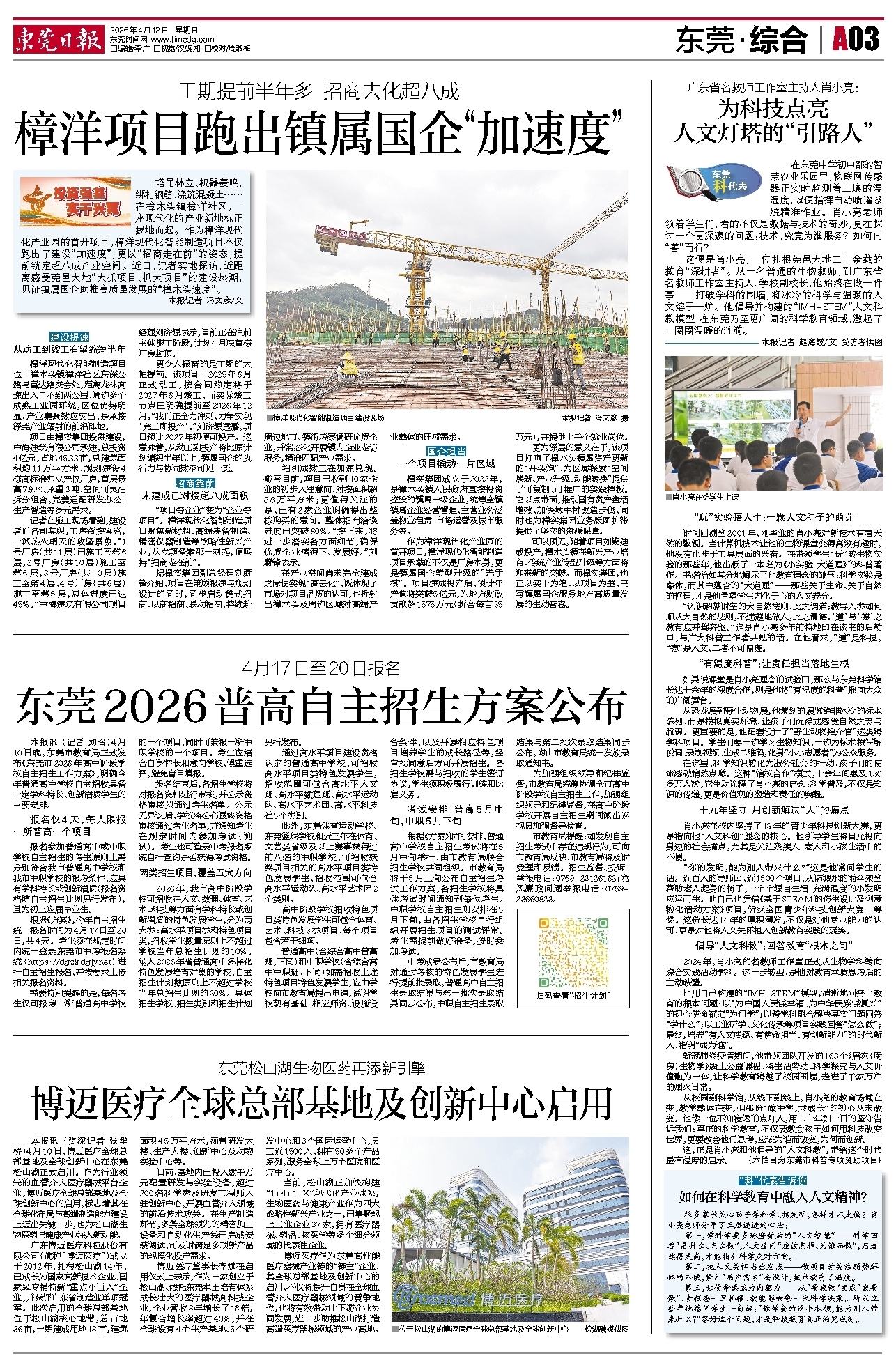 <div style='font-size: 16px!important;line-height: 28px!important;text-align: justify;color: #777!important;'>4月17日至20日报名</div><div style='font-size: 22px!important;line-height: 34px!important;text-align: justify!important;color: #000!important'>东莞2026普高自主招生方案公布</div><div style='font-size: 14px!important;line-height: 22px!important;text-align: left!important;color: #777!important;margin-top: 20px;'>东莞日报  记者 刘召  2026-04-12</div><div><img id='paperImg' style='max-width: 100%;height: auto' src='//img.founderfx.cn/epaper/202604/12/873229e409df407cb8f7653fe94ddc95/3.jpg' alt='' class='page-img'/></div><p> 本报讯 4月10日晚,东莞市教育局正式发布《东莞市2026年高中阶段学校自主招生工作方案》,明确今年普通高中学校自主招收具备一定学科特长、创新潜质学生的主要安排。</p><p> 报名仅4天,每人限报一所普高一个项目</p><p> 报名参加普通高中或中职学校自主招生的考生原则上需分别符合我市普通高中学校和我市中职学校的报考条件,应具有学科特长或创新潜质(报名资格随自主招生计划另行发布),且为初三应届毕业生。</p><p> 根据《方案》,今年自主招生统一报名时间为4月17日至20日,共4天。考生须在规定时间内统一登录东莞市中考报名系统(https://dgzk.dgjy.net)进行自主招生报名,并按要求上传相关报名资料。</p><p> 需要特别提醒的是,每名考生仅可报考一所普通高中学校的一个项目,同时可兼报一所中职学校的一个项目。考生应结合自身特长和意向学校,慎重选择,避免盲目填报。</p><p> 报名结束后,各招生学校将对报名资料进行审核,并公示资格审核拟通过考生名单。公示无异议后,学校将公布最终资格审核通过考生名单,并通知考生在规定时间内参加考试(测试)。考生也可登录中考报名系统自行查询是否获得考试资格。</p><p> 两类招生项目,覆盖五大方向</p><p> 2026年,我市高中阶段学校可招收在人文、数理、体育、艺术、科技等方面有学科特长或创新潜质的特色发展学生,分为两大类:高水平项目类和特色项目类,招收学生数量原则上不超过学校当年总招生计划的10%。纳入2026年省普通高中多样化特色发展培育对象的学校,自主招生计划数原则上不超过学校当年总招生计划的20%。具体招生学校、招生类别和招生计划另行发布。</p><p> 通过高水平项目建设资格认定的普通高中学校,可招收高水平项目类特色发展学生,招收范围可包含高水平人文班、高水平数理班、高水平运动队、高水平艺术团、高水平科技社5个类别。</p><p> 此外,东莞体育运动学校、东莞篮球学校和近三年在体育、文艺类省级及以上赛事获得过前八名的中职学校,可招收获奖项目相关的高水平项目类特色发展学生,招收范围可包含高水平运动队、高水平艺术团2个类别。</p><p> 高中阶段学校招收特色项目类特色发展学生可包含体育、艺术、科技3类项目,每个项目包含若干细项。</p><p> 普通高中(含综合高中普高班,下同)和中职学校(含综合高中中职班,下同)如需招收上述特色项目特色发展学生,应由学校向市教育局提出申请,说明学校现有基础、相应师资、设施设备条件,以及开展相应特色项目培养学生的成长路径等,经审批同意后方可开展招生。各招生学校需与招收的学生签订协议,学生须积极履行训练和比赛义务。</p><p> 考试安排:普高5月中旬,中职5月下旬</p><p> 根据《方案》时间安排,普通高中学校自主招生考试将在5月中旬举行,由市教育局联合招生学校共同组织。市教育局将于5月上旬公布自主招生考试工作方案,各招生学校将具体考试时间通知到每位考生。中职学校自主招生则安排在5月下旬,由各招生学校自行组织开展招生项目的测试评审。考生需提前做好准备,按时参加考试。</p><p> 中考成绩公布后,市教育局对通过考核的特色发展学生进行提前批录取,普通高中自主招生录取结果与第一批次录取结果同步公布,中职自主招生录取结果与第二批次录取结果同步公布,均由市教育局统一发放录取通知书。</p><p> 为加强组织领导和纪律监督,市教育局统筹协调全市高中阶段学校自主招生工作,加强组织领导和纪律监督,在高中阶段学校开展自主招生期间派出巡视员加强督导检查。</p><p> 市教育局提醒:如发现自主招生考试中存在违规行为,可向市教育局反映,市教育局将及时受理和反馈。招生监督、投诉、举报电话:0769-23126162;党风廉政问题举报电话:0769-23660823。</p>